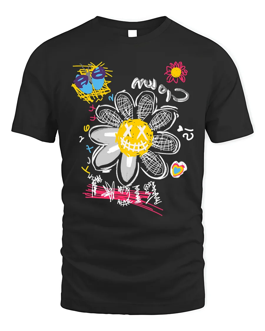 Featuring a hand-drawn flower with a playful stitched smiley face, this design bursts with graffiti-style sketches, scribbles, and bright accents that capture the spirit of urban art. Every detail pops against the black background, creating a unique streetwear statement that feels both rebellious and effortlessly cool.