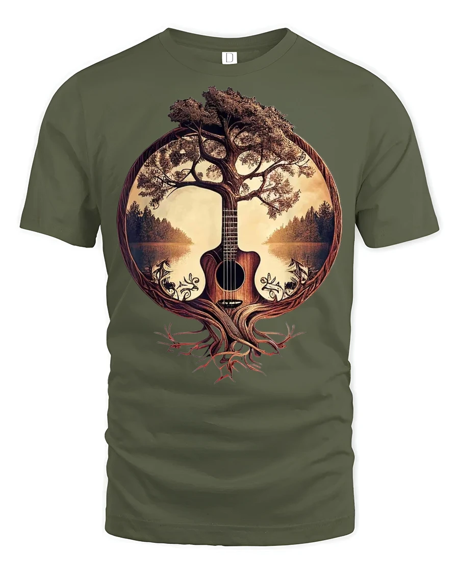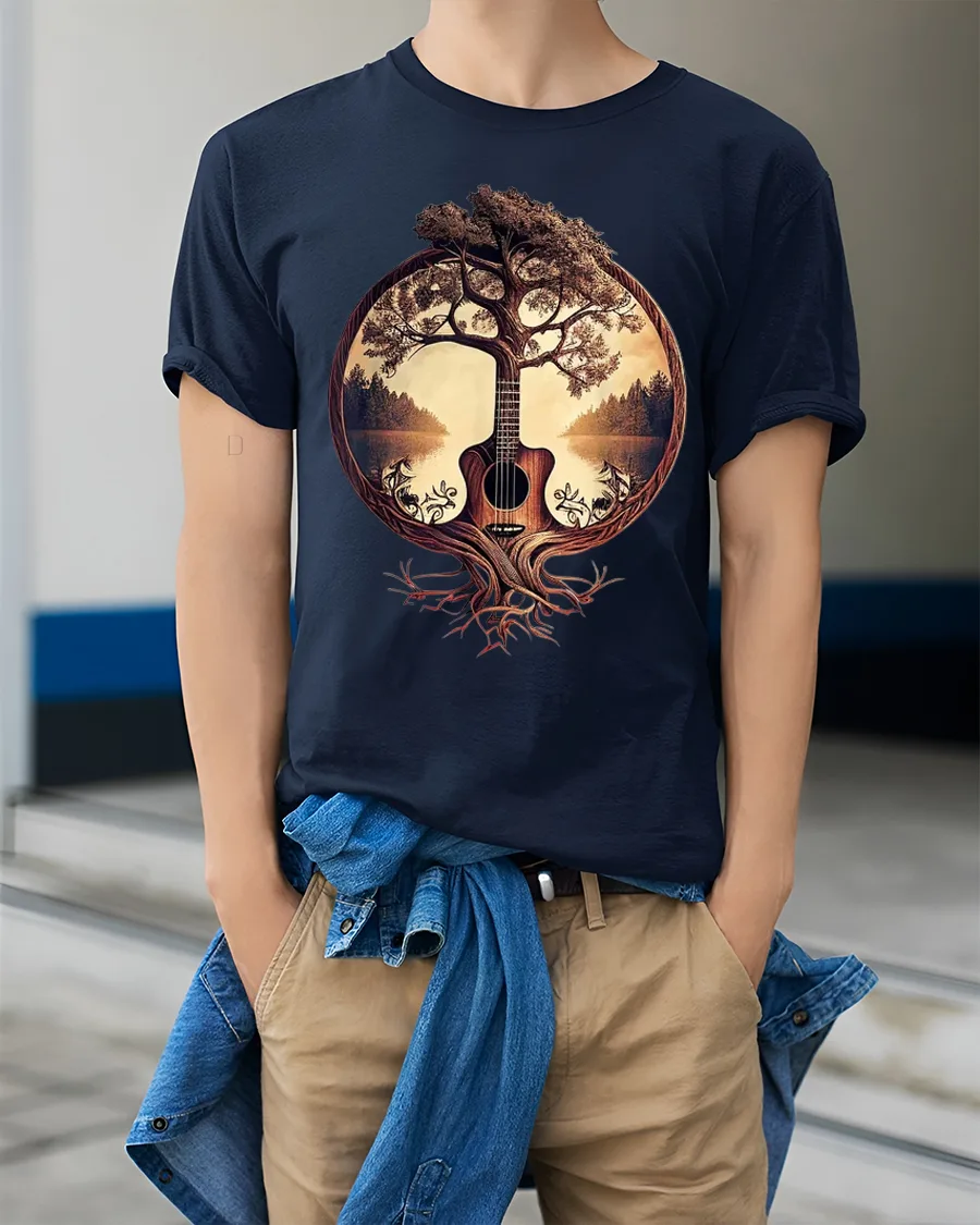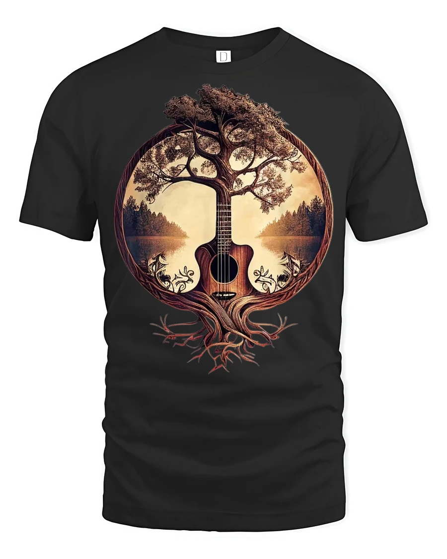 This guitar t shirt celebrates the harmony between music and nature through a creative tree of life concept.