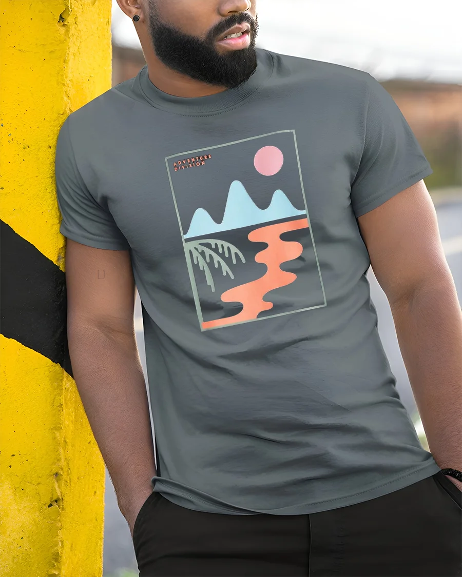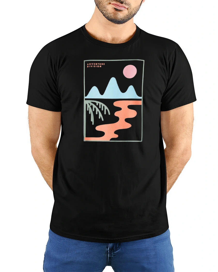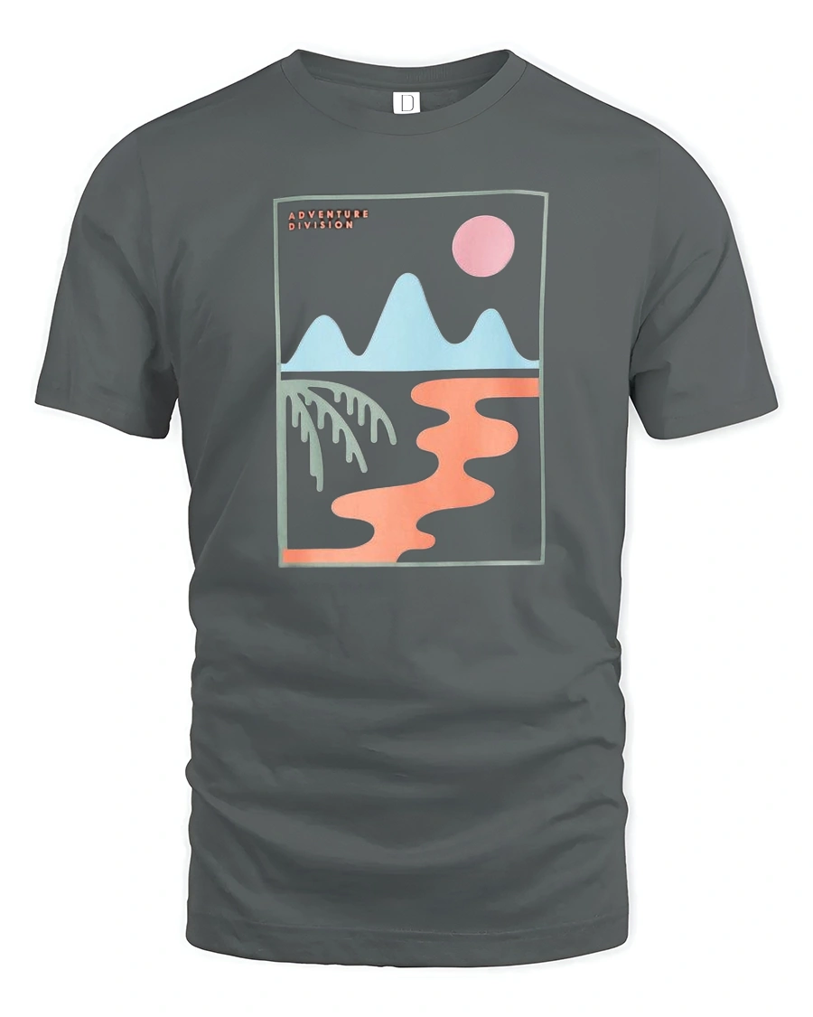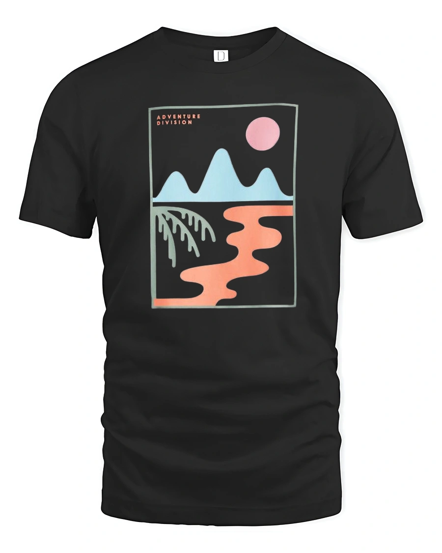 Adventure Division Retro Landscape Graphic Tee Modern Art Vibe Tshirt blends a clean artistic design with a sense of exploration and creativity.