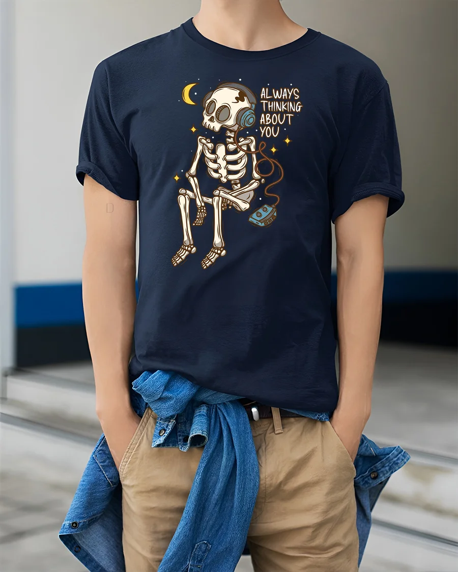Always Thinking About You Skeleton Music Lover Tee Tshirt - model wearing navy tee with hands in pockets