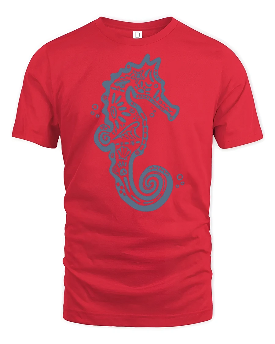 Artistic Seahorse Ocean Graphic Tee Coastal Marine Style - red t-shirt on white background