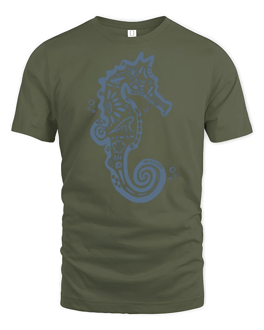 Artistic Seahorse Ocean Graphic Tee Coastal Marine Style - military green t-shirt on white background
