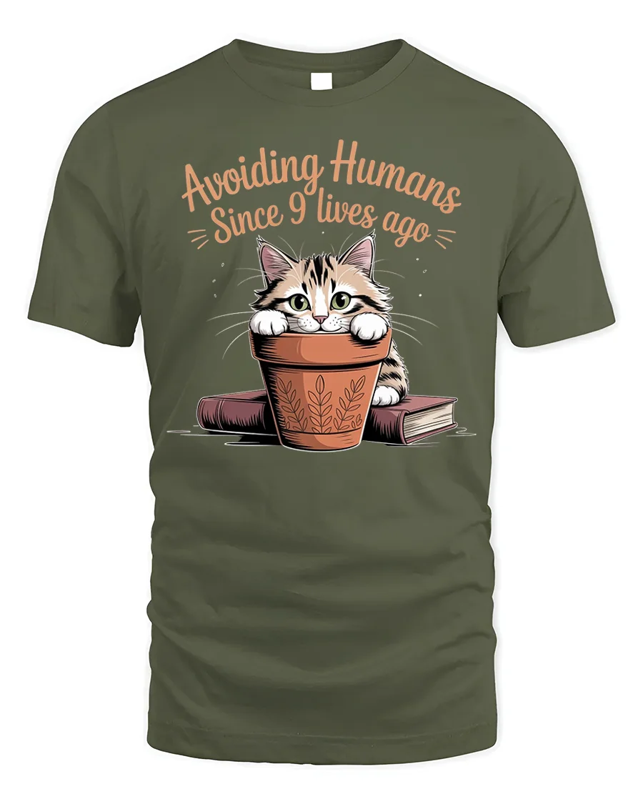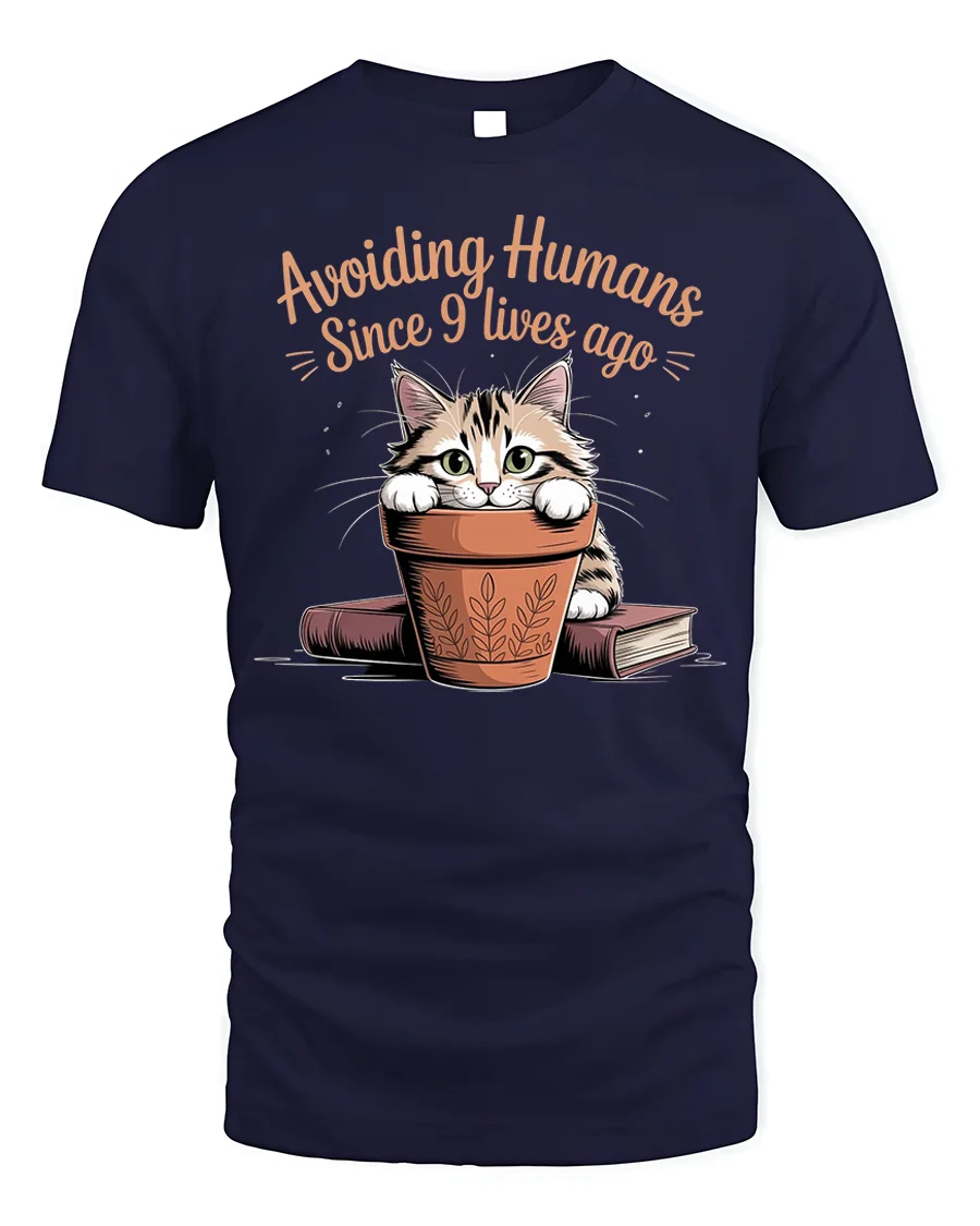 Bring humor and feline charm into your wardrobe with the Avoiding Humans Funny Cat Graphic T-Shirt Tee. Featuring an adorable cat hiding inside a flower pot with the cheeky phrase “Avoiding Humans Since 9 Lives Ago,” this shirt perfectly captures the playful and sarcastic personality that cat lovers adore. It’s a fun way to show off your love for cats while adding a quirky touch to your everyday style.