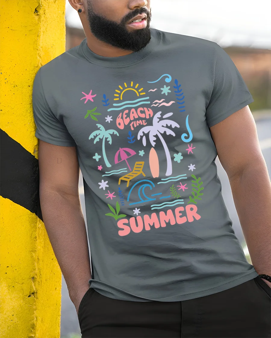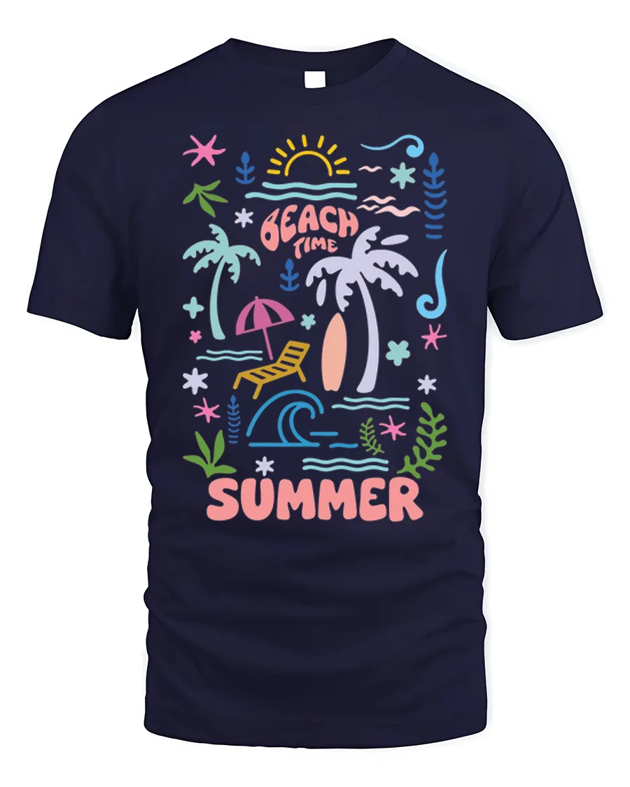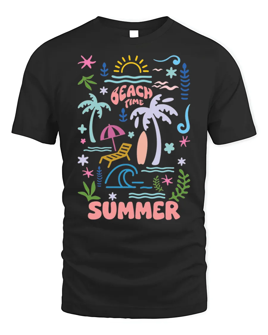 Bring the sunshine to your wardrobe with the Beach Time Summer Vibes Graphic T-Shirt – the perfect tee for anyone who loves the ocean breeze, sandy shores, and tropical adventures. Featuring a playful and colorful design with palm trees, waves, sun, surfboard, and summer essentials, this t-shirt captures the carefree spirit of beach life.