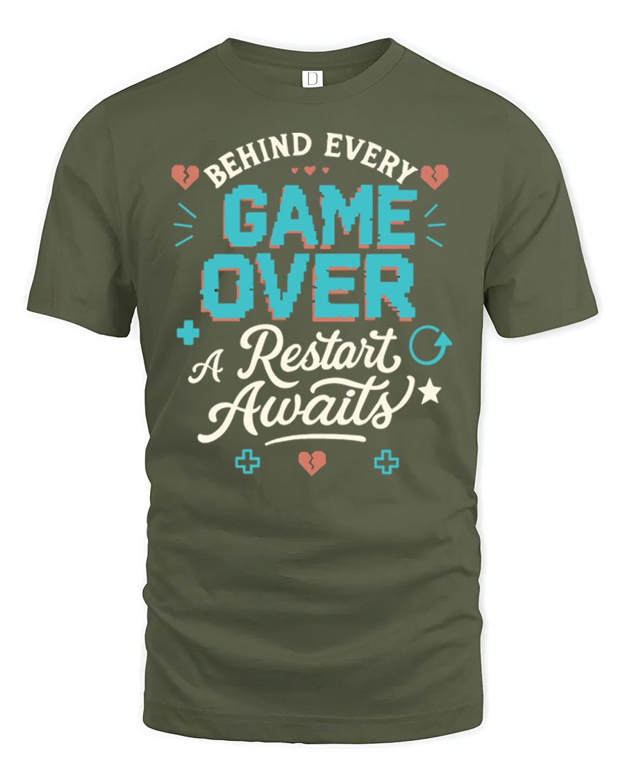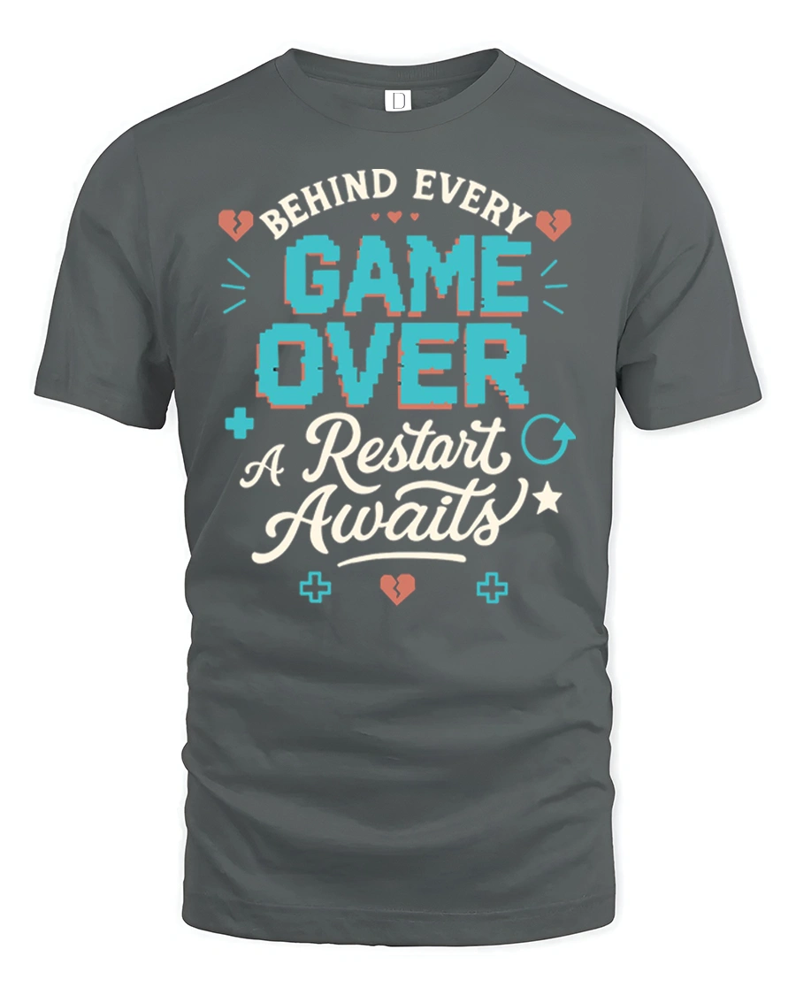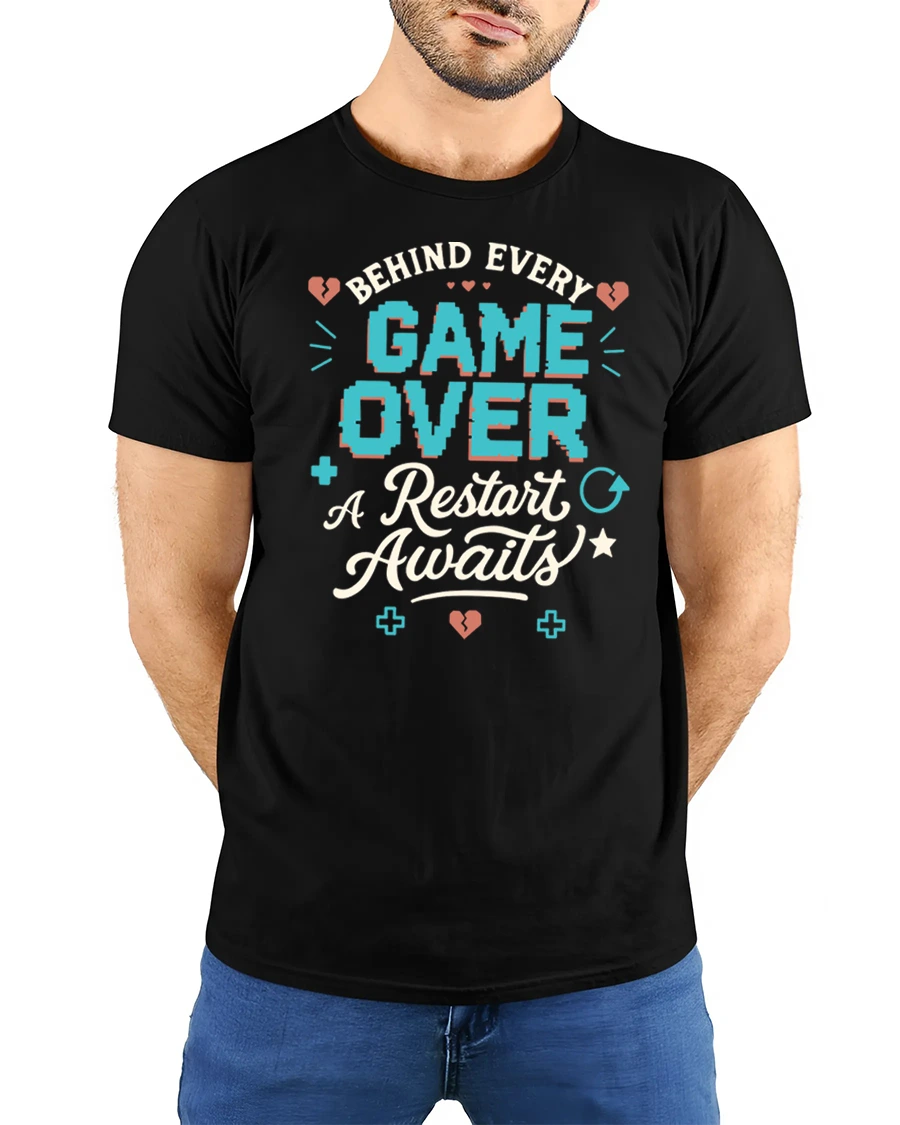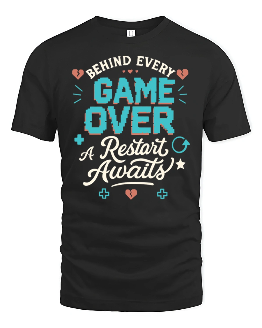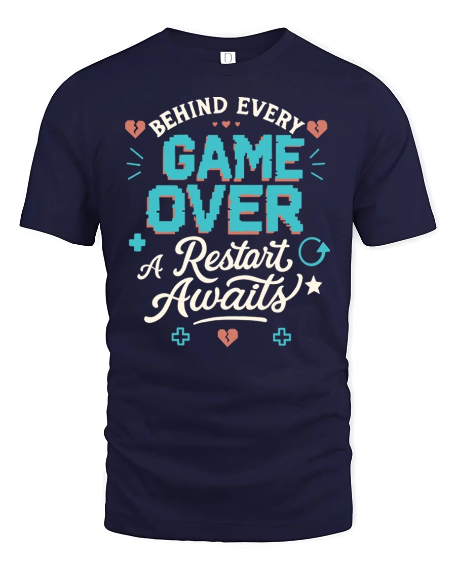 This retro gamer graphic t shirt features the inspiring phrase Behind Every Game Over A Restart Awaits, combining gaming humor with a positive mindset that every gamer understands. The bold pixel inspired lettering and playful gaming icons create a nostalgic arcade vibe that captures the spirit of classic video games. This design reminds gamers that every challenge in a game is simply another chance to try again and level up.