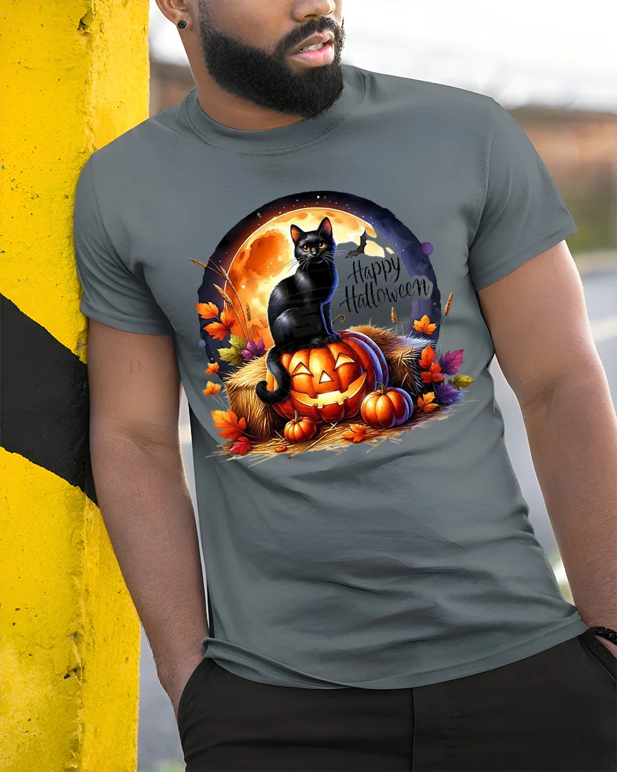 Designed with U.S. customers in mind, this pumpkin and black cat t-shirt pairs easily with jeans, jackets, or layered autumn outfits.