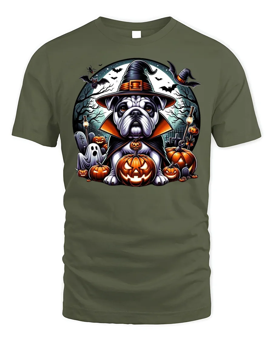 Bulldog Witch Hat Pumpkin Halloween Tshirt Style - military green t-shirt on white background