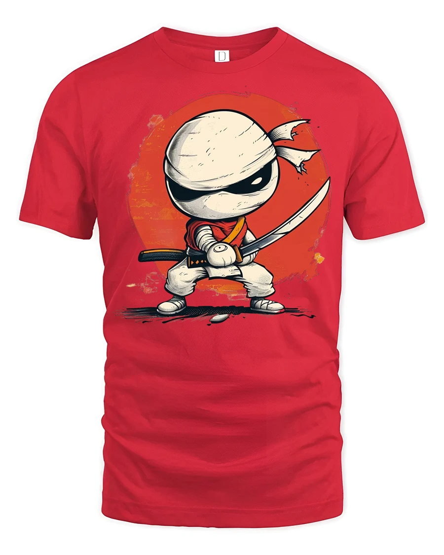 Featuring an adorable ninja character holding a sword with a bold red background, this design captures action and charm in a playful way.
