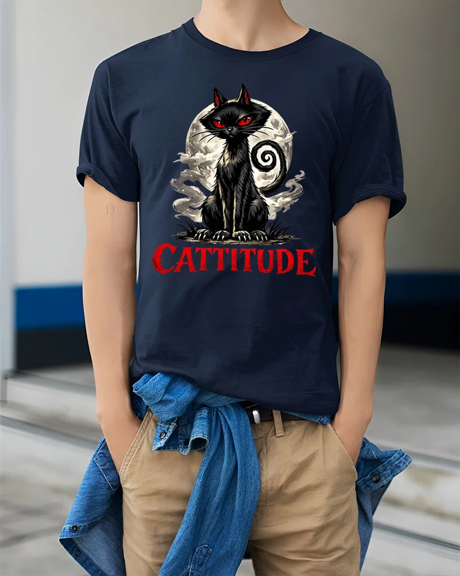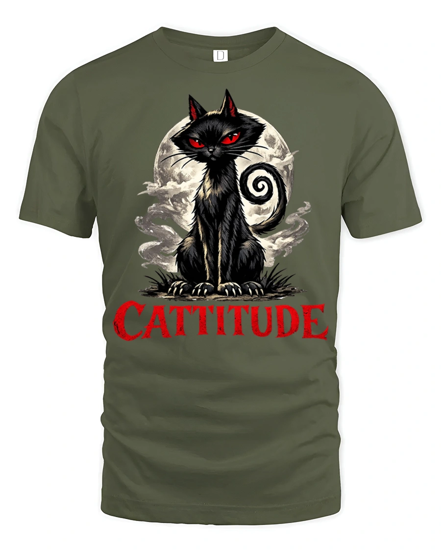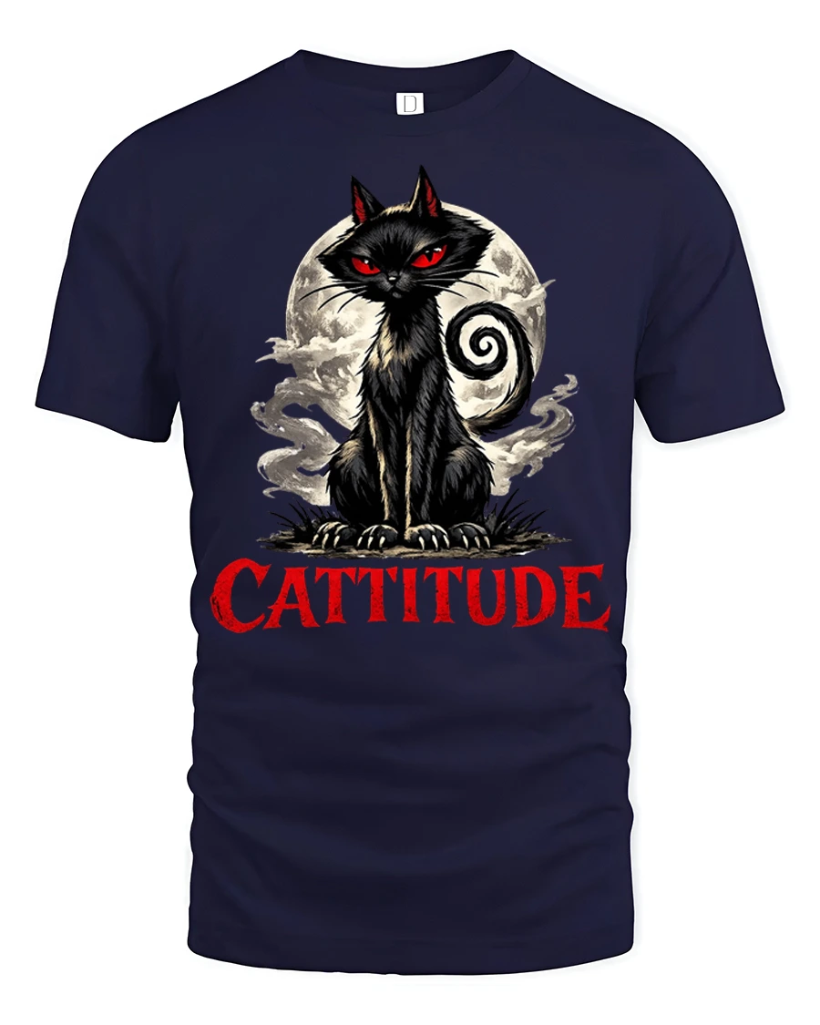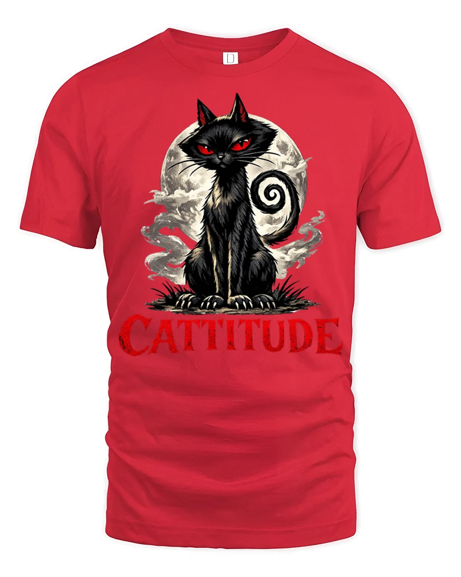 The design features a striking black cat with glowing red eyes sitting in front of a full moon while the bold word Cattitude highlights its fearless personality.