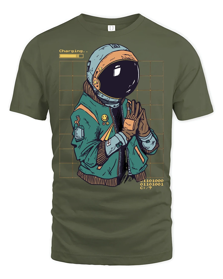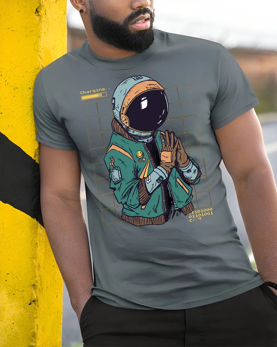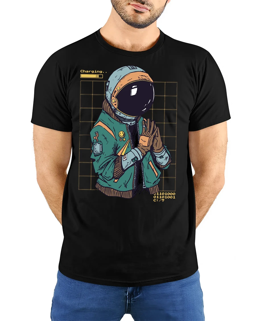 This astronaut themed graphic tee brings together retro futuristic elements and a touch of humor that feels both creative and visually engaging. The illustrated character, digital style background, and playful charging detail create a fun concept inspired by technology, gaming culture, and the mystery of space exploration. The artistic style gives the design a modern and imaginative vibe.