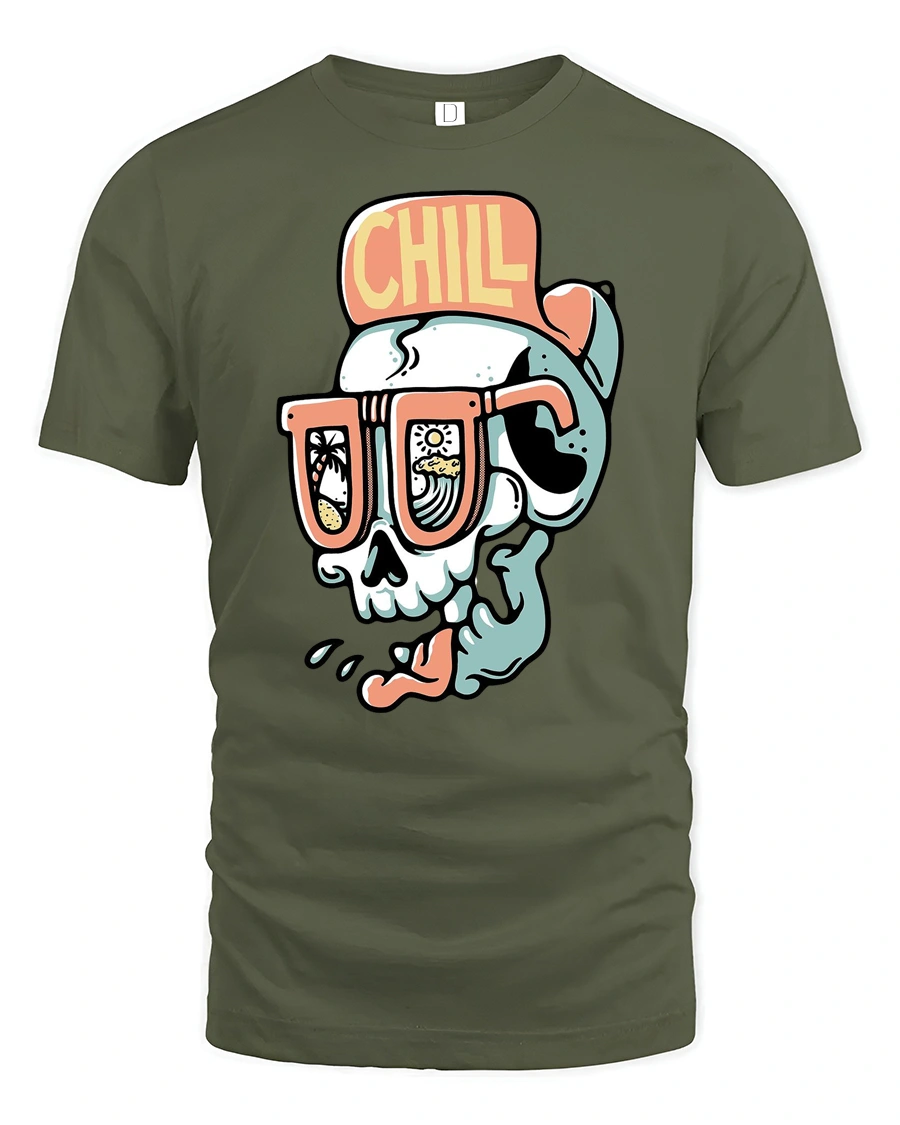 Chill Skull Beach Sunglasses Summer Vibe Funny Graphic Tee Tshirt - military green t-shirt on white background
