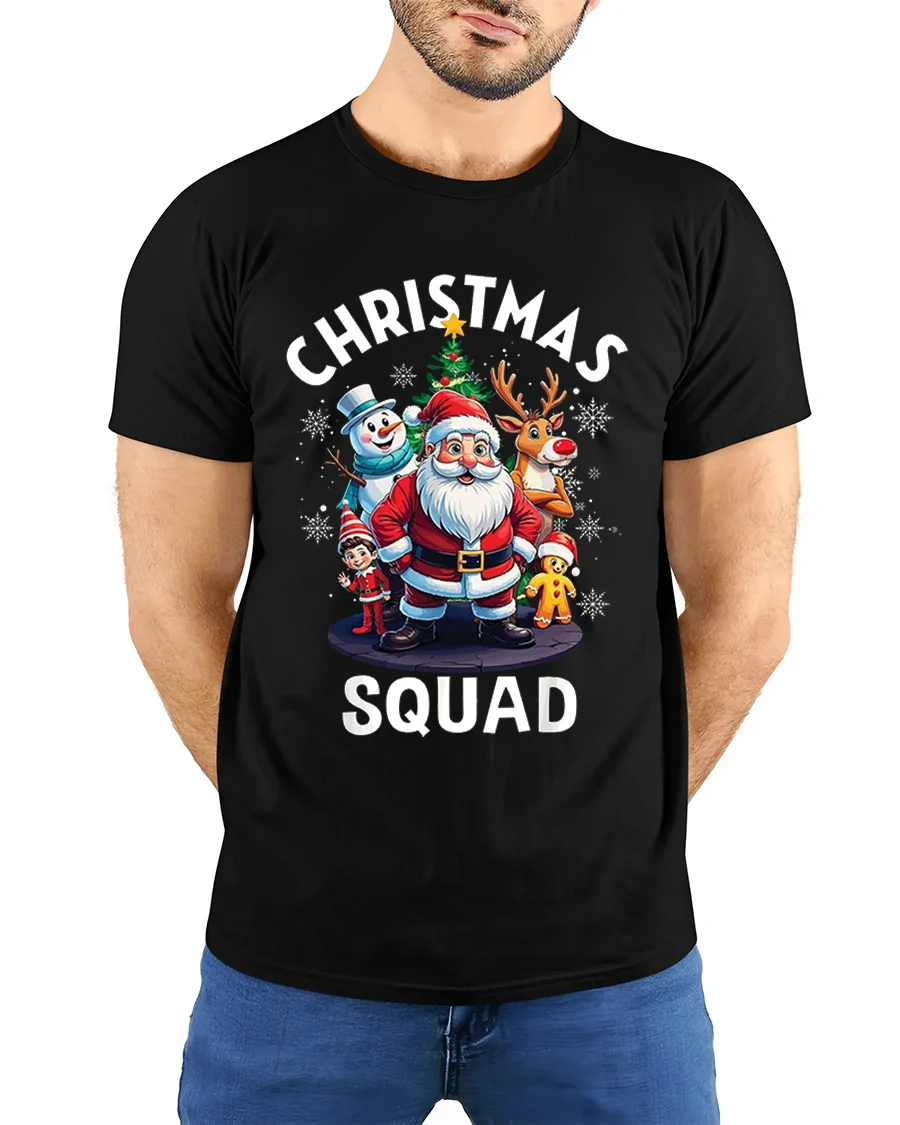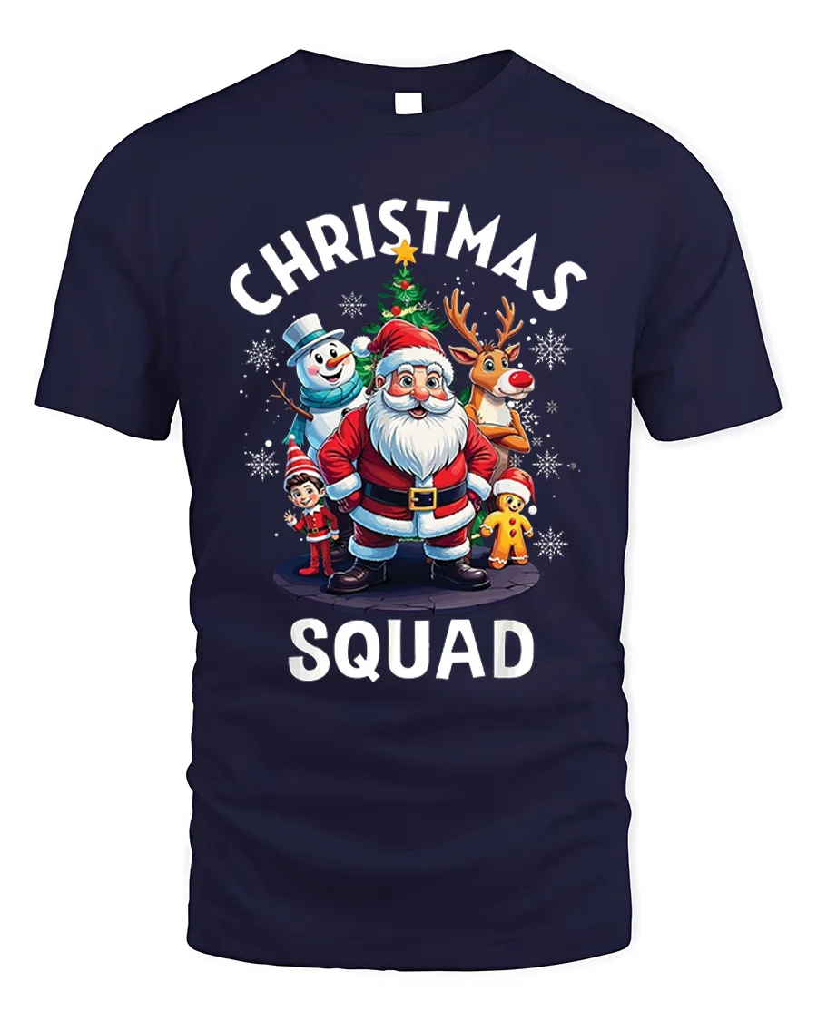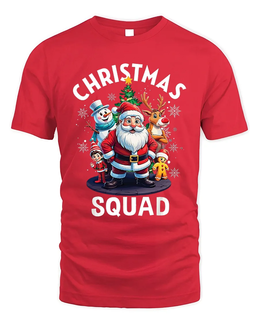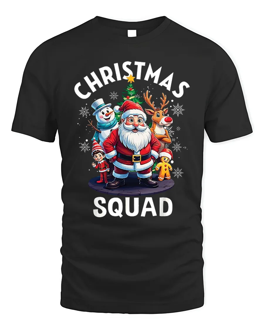 Get into the holiday spirit with the Christmas Squad Santa Reindeer Snowman Funny Holiday Tshirt, a cheerful design that brings together your favorite Christmas characters. Featuring Santa, Rudolph, a snowman, an elf, and a gingerbread man surrounded by snowflakes and a festive tree, this tee perfectly captures the joy and magic of the season.