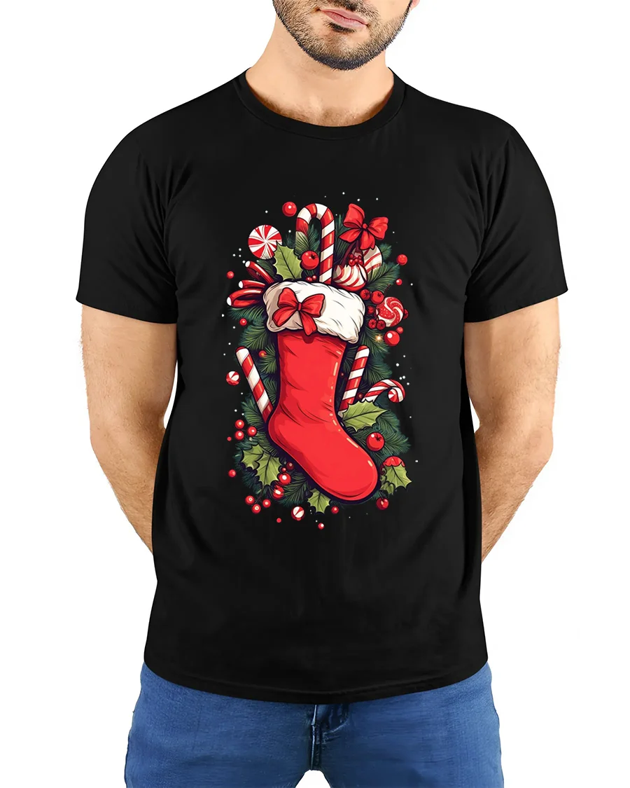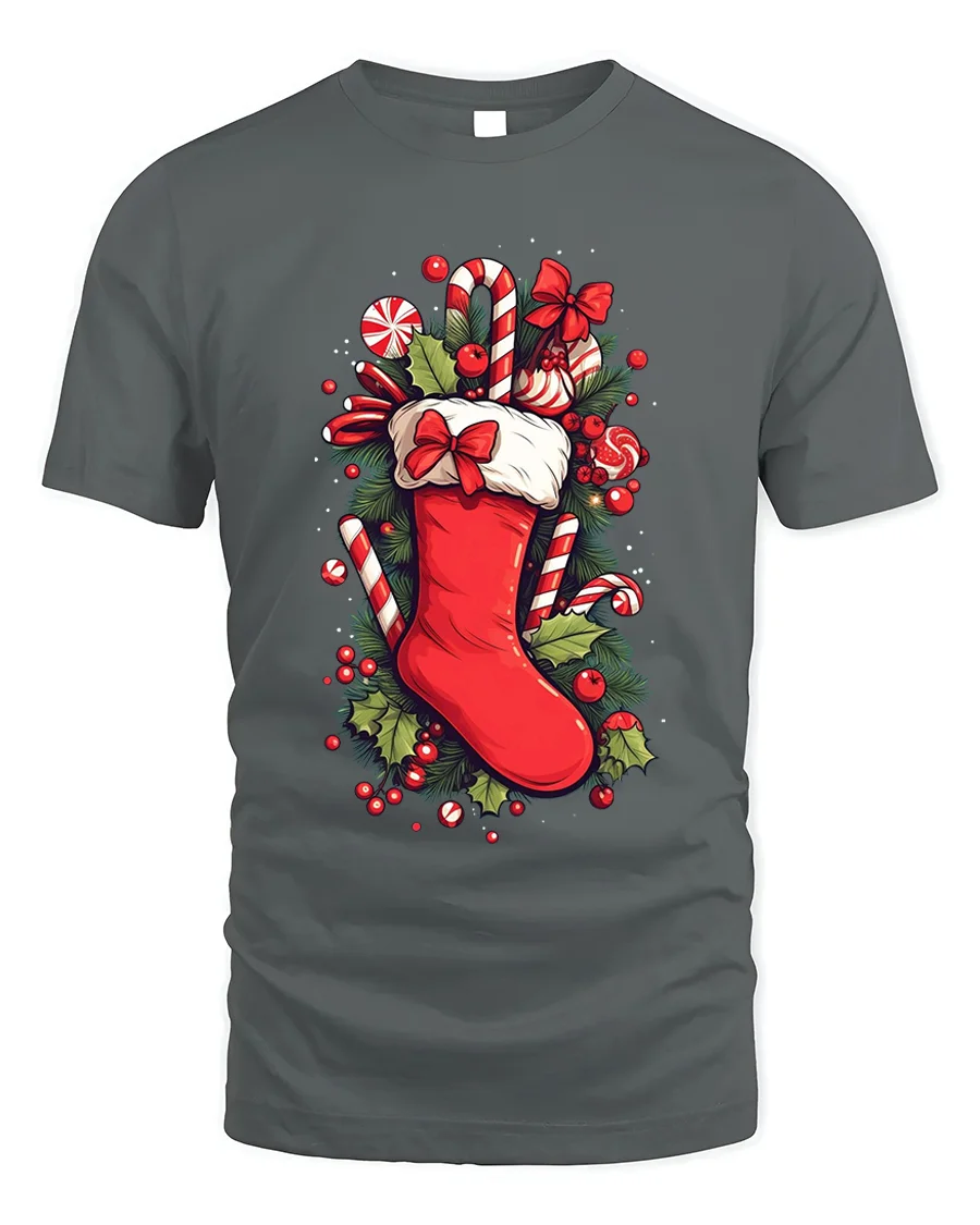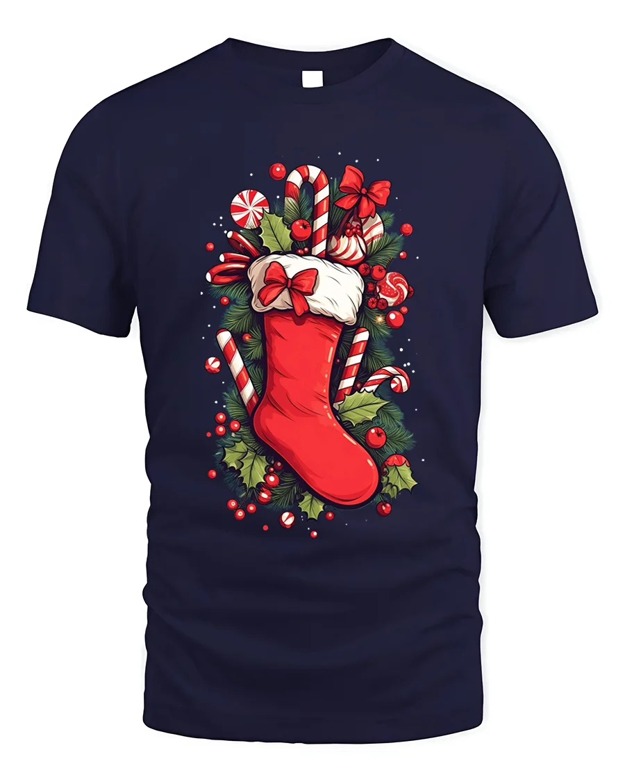 Celebrate the magic of the season with the Christmas Stocking Candy Cane Festive Holiday Spirit Tshirt. This cheerful design showcases a classic red Christmas stocking filled with candy canes, holly, berries, and festive ornaments — capturing the joyful essence of holiday traditions. Its colorful and detailed artwork brings warmth and fun to your seasonal wardrobe.