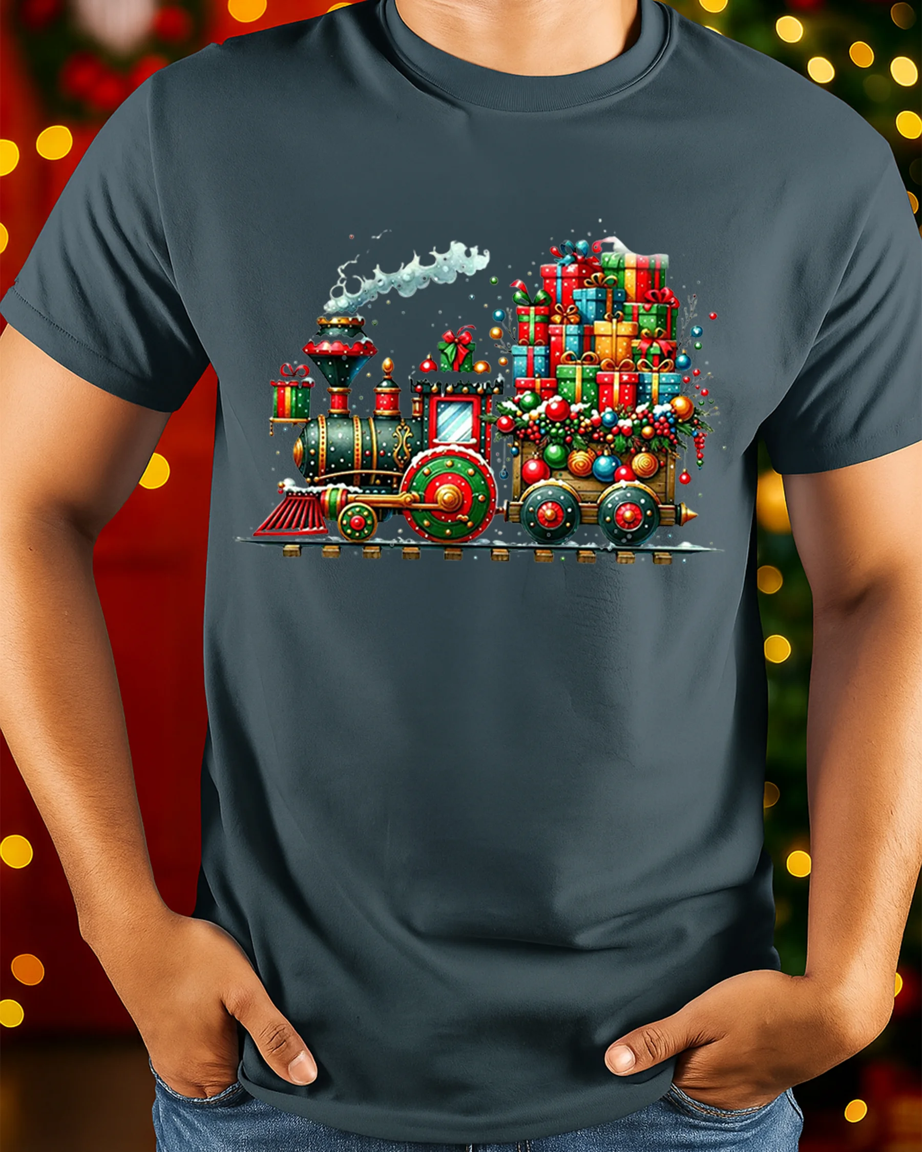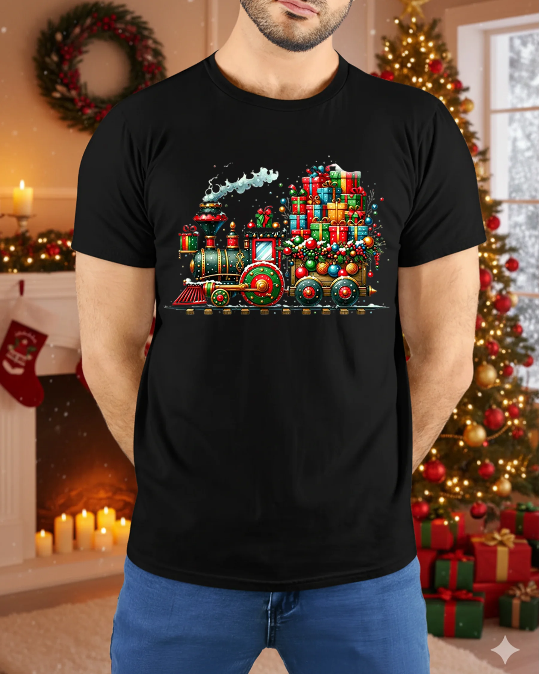 Crafted from soft, breathable fabric, this t-shirt ensures comfort throughout all your winter activities—from decorating the tree to attending festive gatherings or enjoying cozy evenings with family. The high-quality print showcases the train’s sparkling lights, glossy ornaments, and stacks of colorful gifts, ensuring the artwork stays vivid and eye-catching even after many washes. Its classic fit makes it easy to pair with jeans, joggers, or layered holiday outfits.