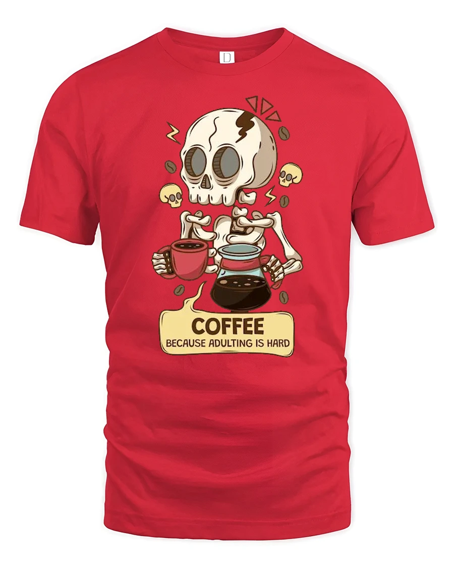 Coffee Because Adulting Is Hard Skeleton Funny T Shirt Tee - red t-shirt on white background