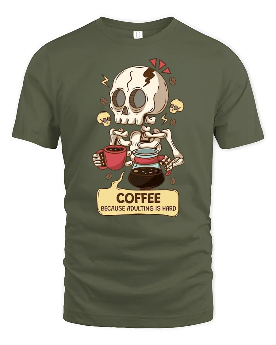 Coffee Because Adulting Is Hard Skeleton Funny T Shirt Tee - military green t-shirt on white background