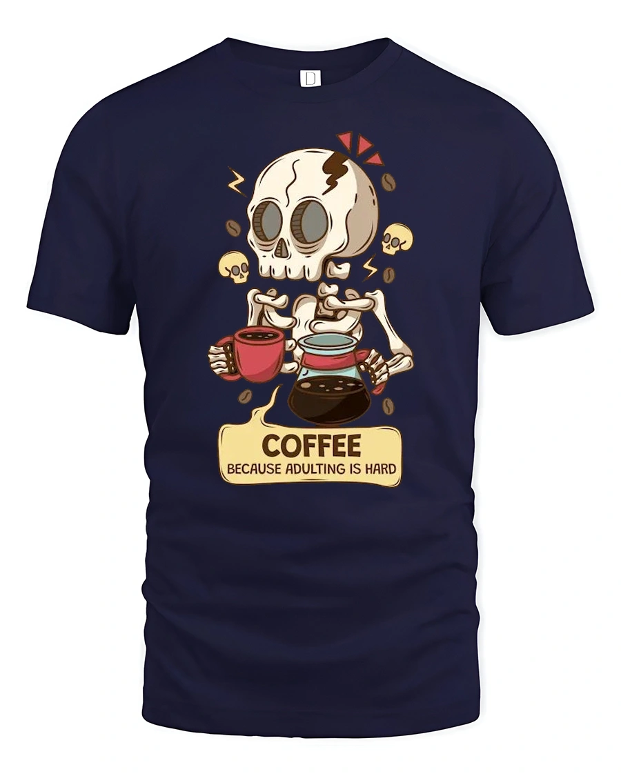 Coffee Because Adulting Is Hard Skeleton Funny T Shirt Tee - navy t-shirt on white background