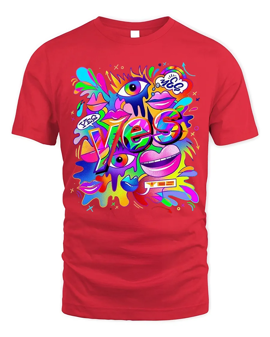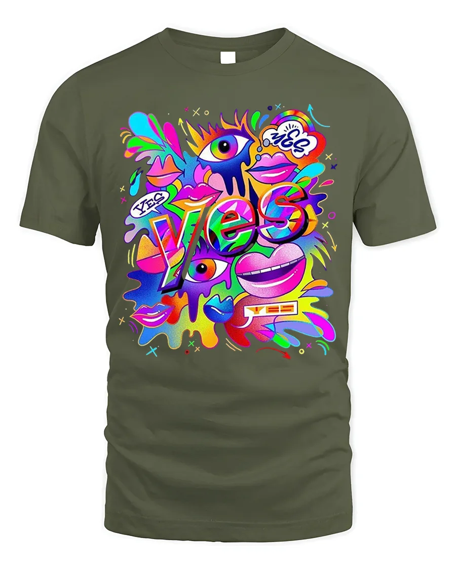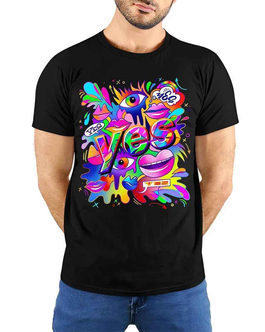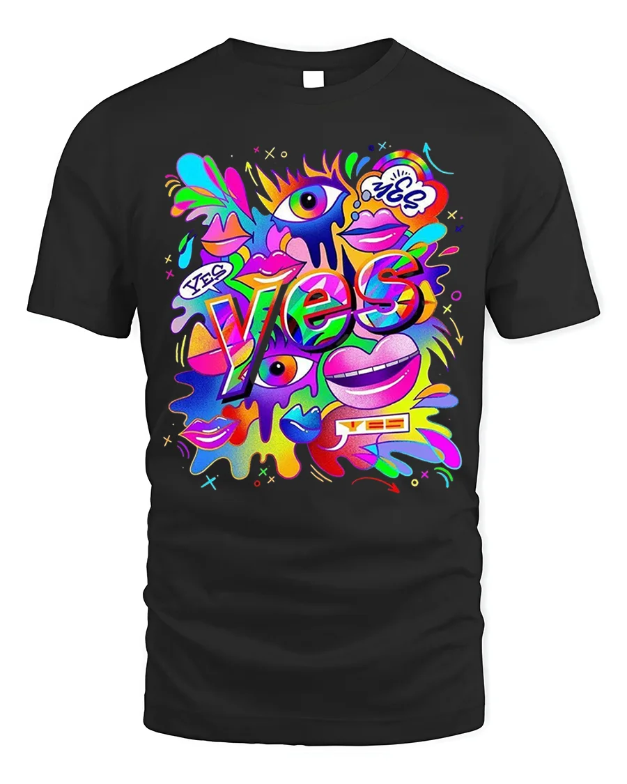 The Colorful Abstract Yes Pop Art Graphic Print T-Shirt is a burst of energy and positivity designed for those who love art, color, and creativity. Featuring a bold “YES” typography surrounded by expressive eyes, lips, and abstract splashes, this tee embodies the spirit of modern pop art. The vibrant mix of neon colors—pink, blue, green, yellow, and orange—creates a playful yet stylish look that instantly stands out.