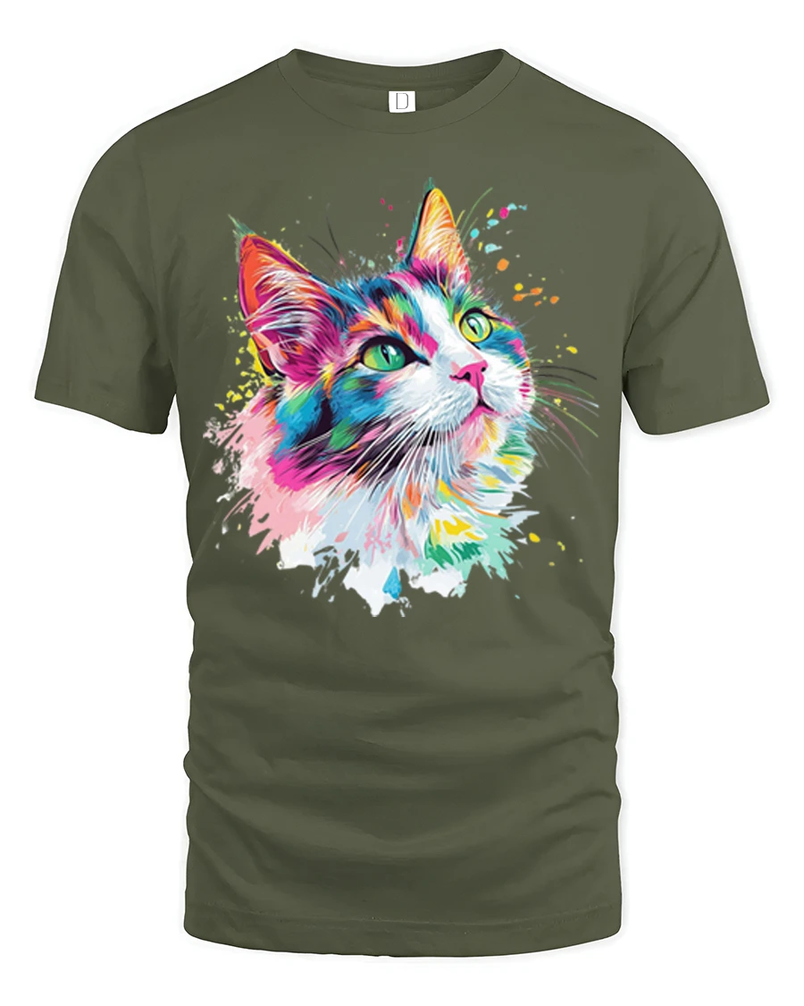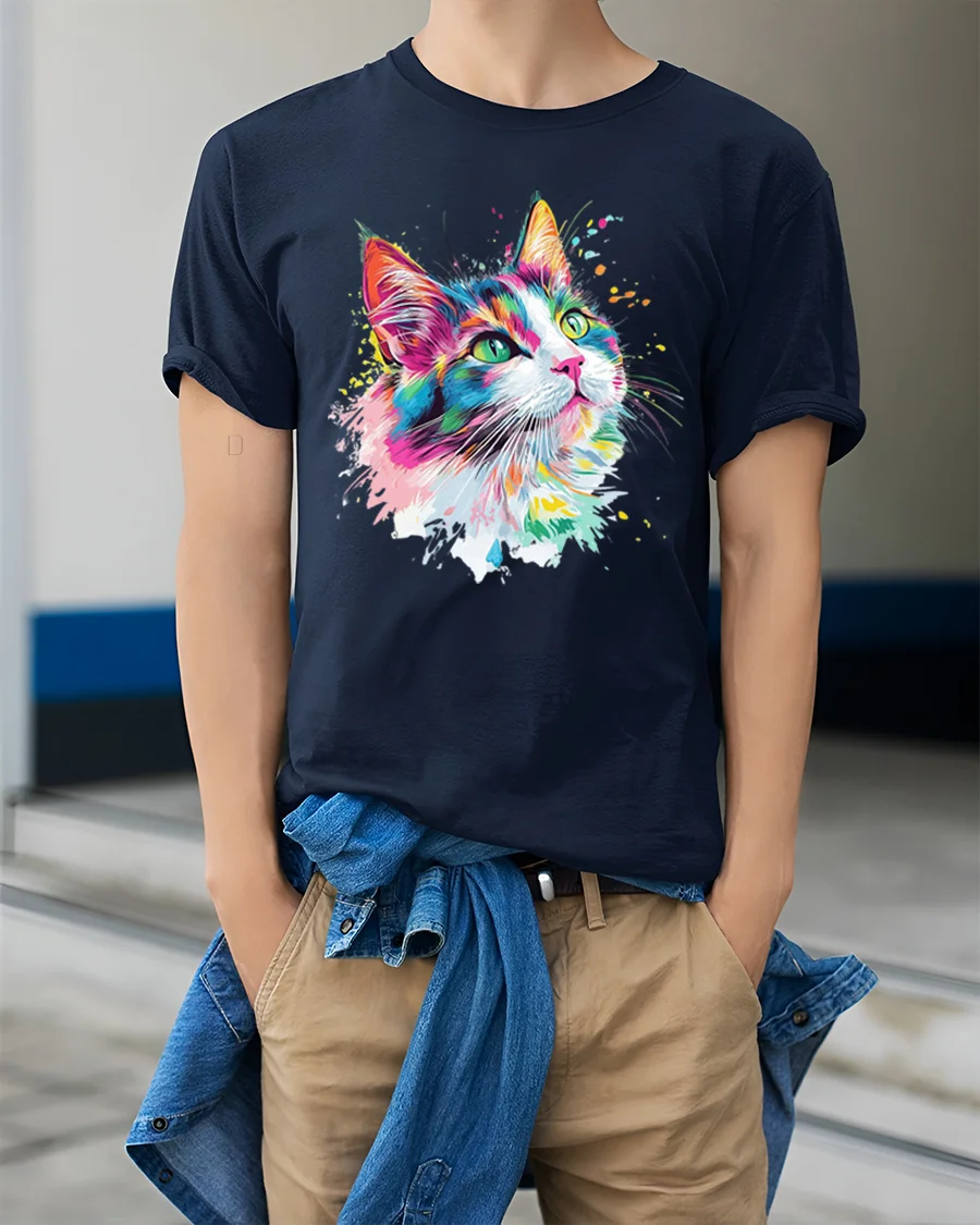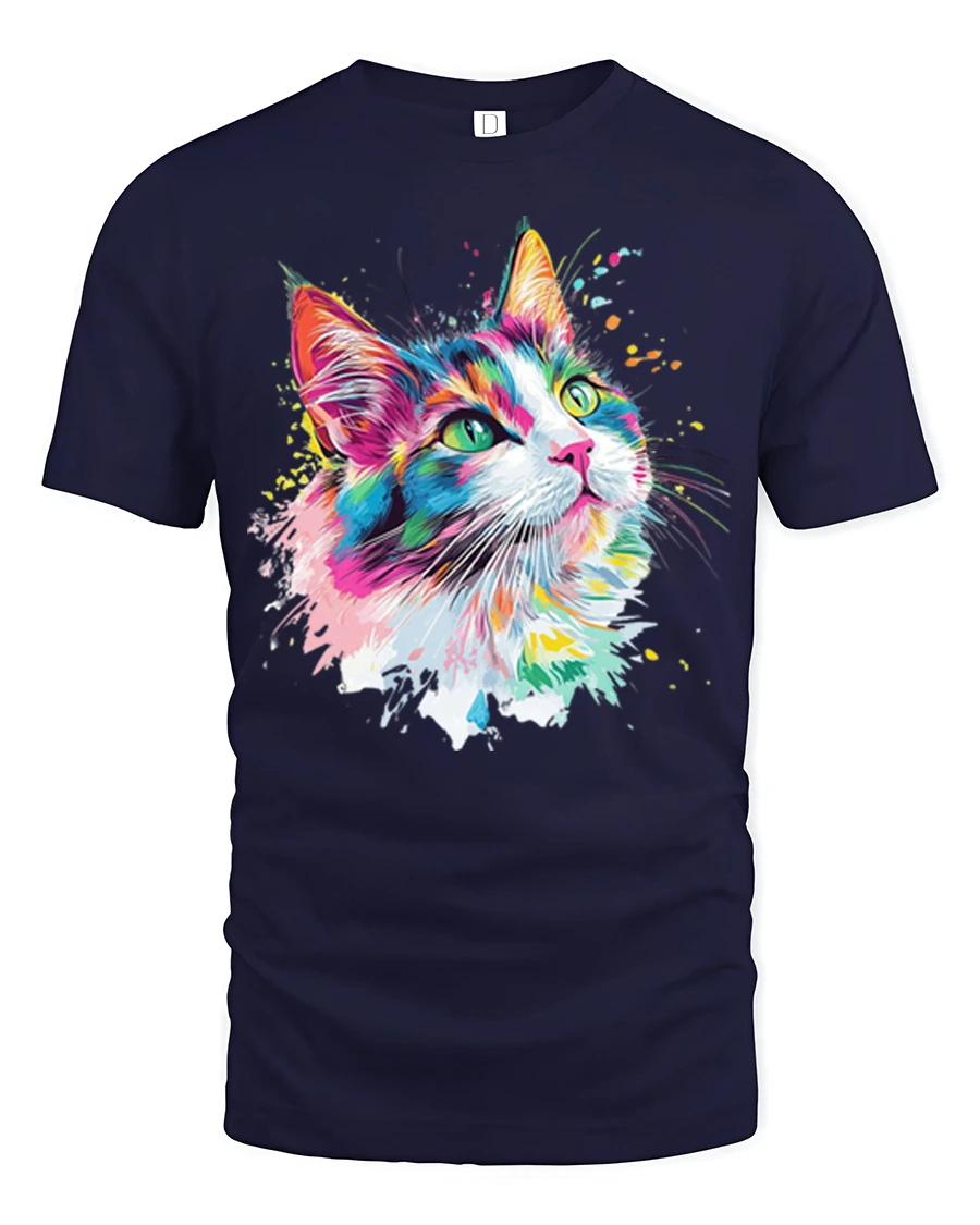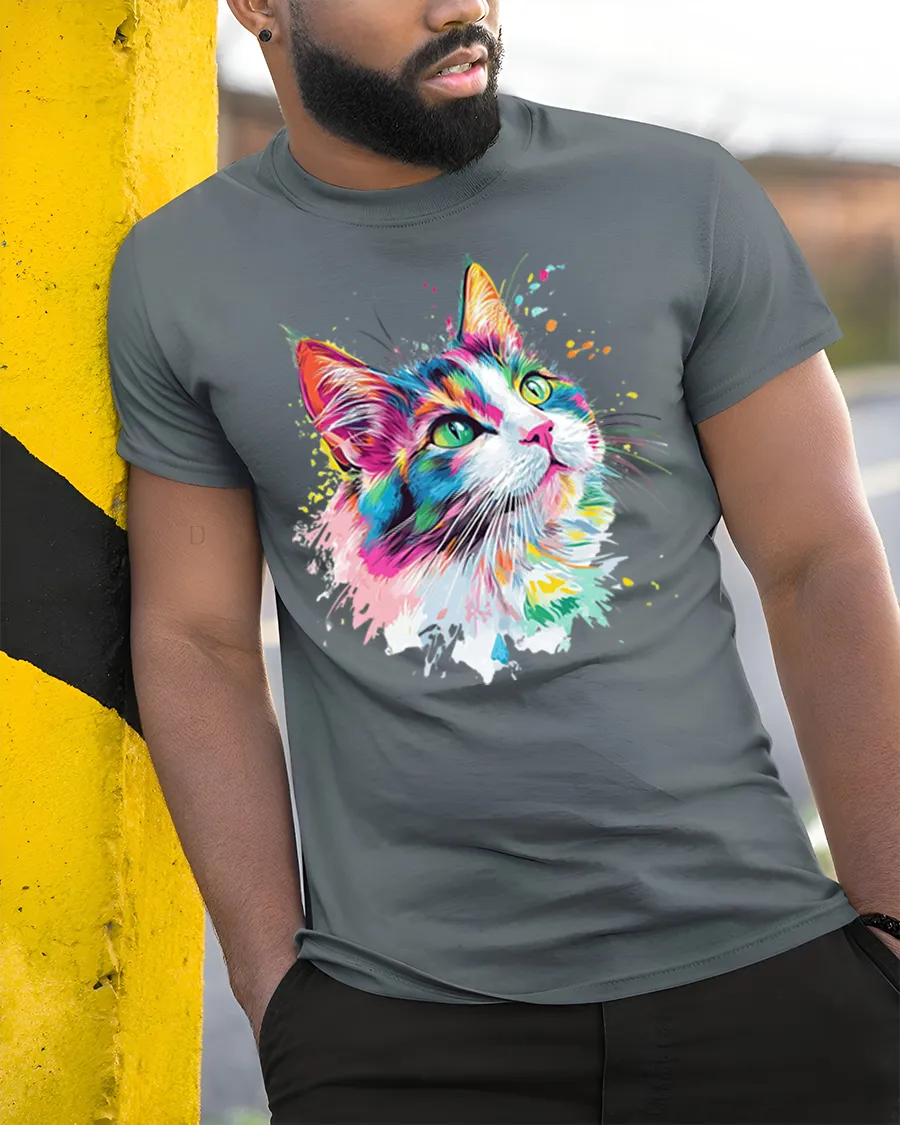 Soft breathable fabric offers comfortable everyday wear while the bold cat graphic remains vivid and eye catching. The expressive color palette and artistic paint splash details add a playful and stylish look that fits perfectly with casual fashion. This artistic cat themed shirt celebrates the charm and elegance of cats through vibrant modern art that brings personality and creativity into a unique graphic tee.