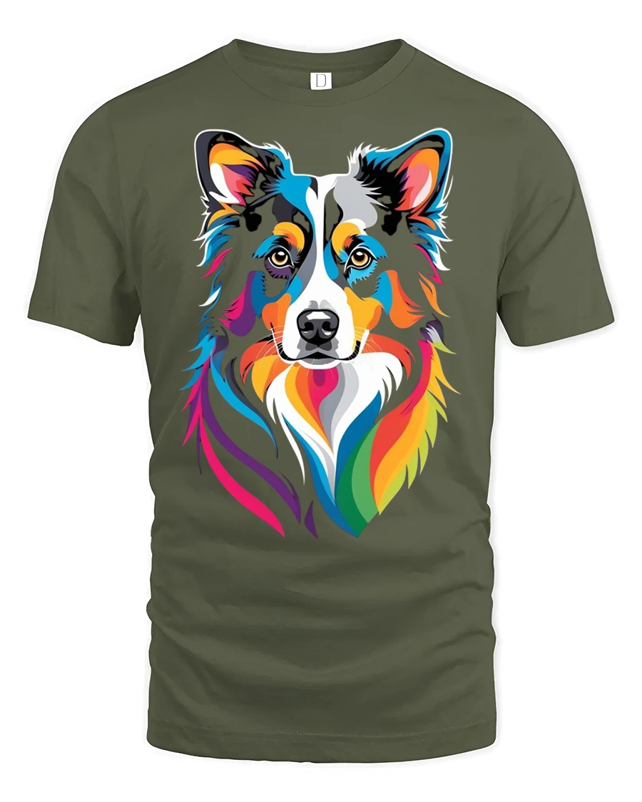 This colorful border collie rainbow pop art dog lover graphic t shirt features a stunning artistic portrait of a border collie brought to life with vibrant rainbow colors and bold modern design.