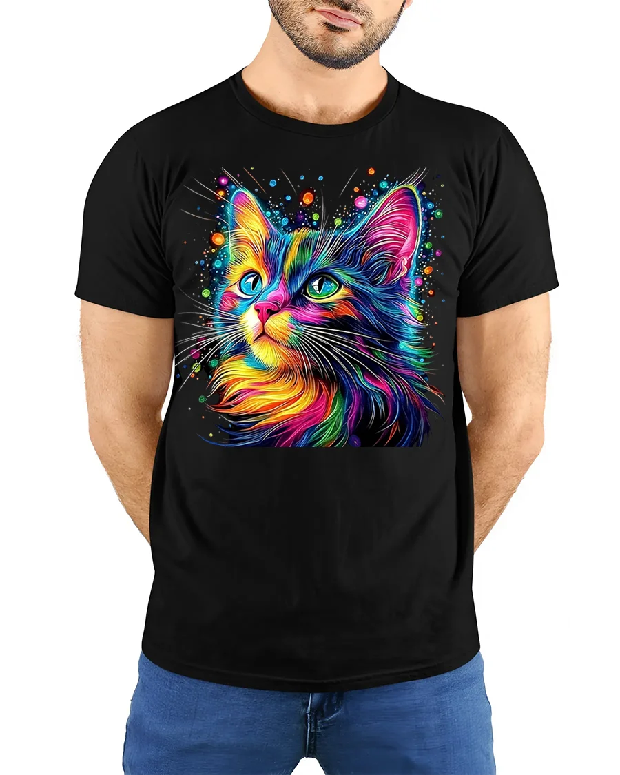 Crafted from soft, breathable fabric, this colorful cat tshirt provides lasting comfort while adding a unique artistic touch to your style. The bright rainbow hues and intricate details make it versatile for casual outings, festivals, or simply lounging at home. It’s easy to pair with jeans, shorts, or joggers, making it a go-to choice for those who want both comfort and personality in their outfits.