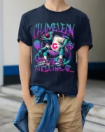The neon tones and graffiti-inspired text give this tee a standout look that pops against the black background.