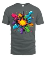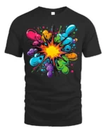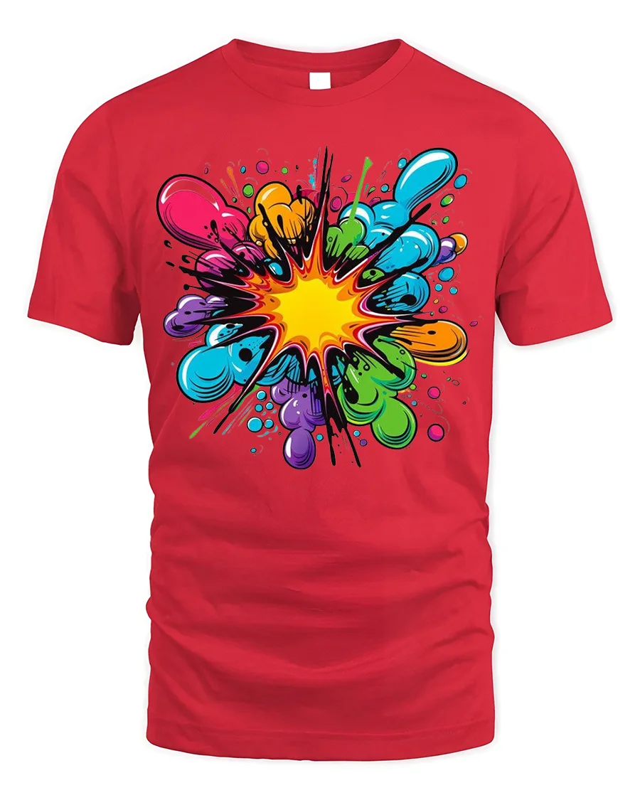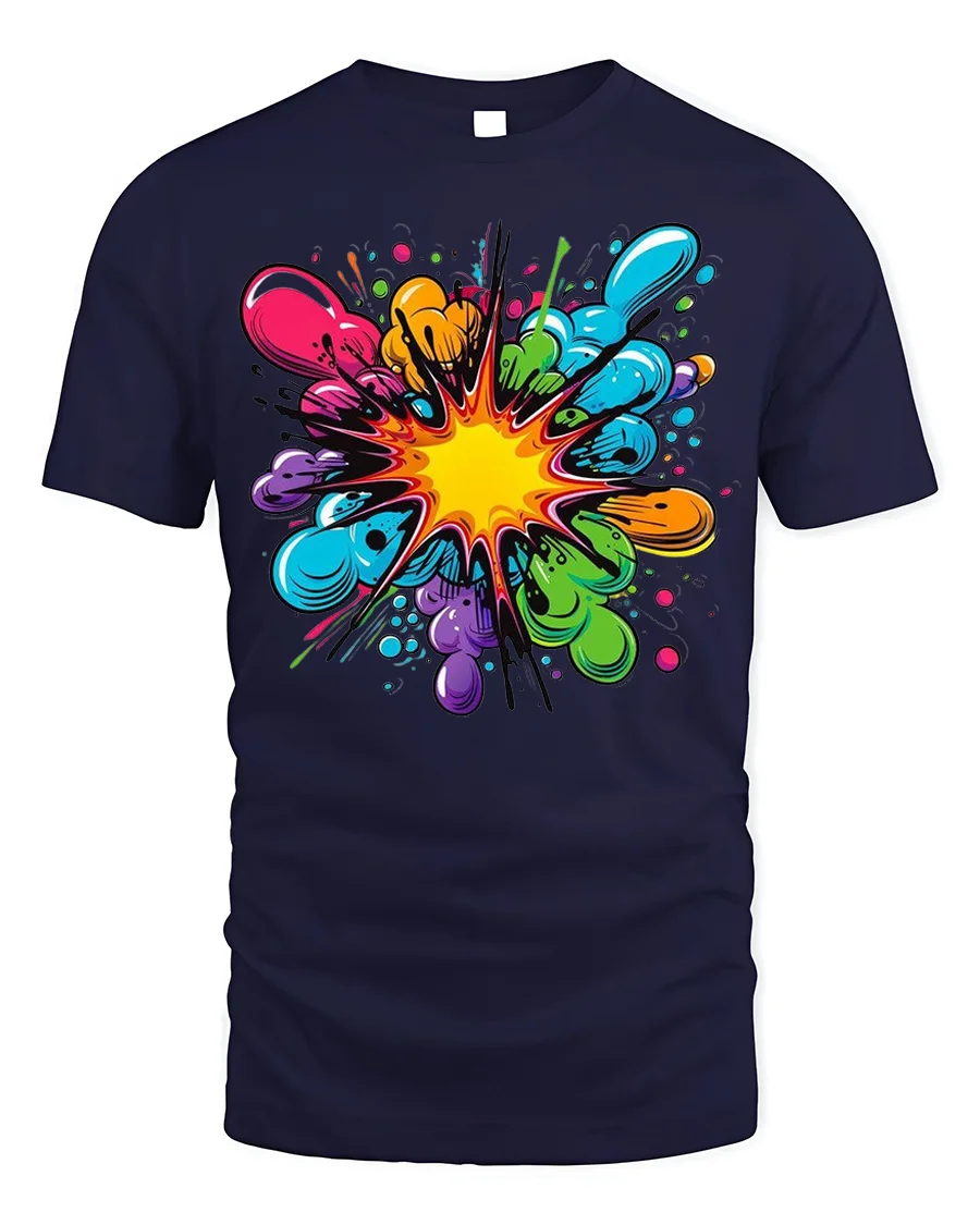 The Colorful Comic Explosion Pop Art Graphic T-Shirt is an explosion of creativity and color that captures the energy of classic comic book style. Featuring a vibrant burst of blues, reds, yellows, greens, and purples, this shirt delivers a powerful statement full of fun and artistic flair. The dynamic splash design radiates from the center, creating a bold visual that instantly grabs attention and adds life to any outfit.