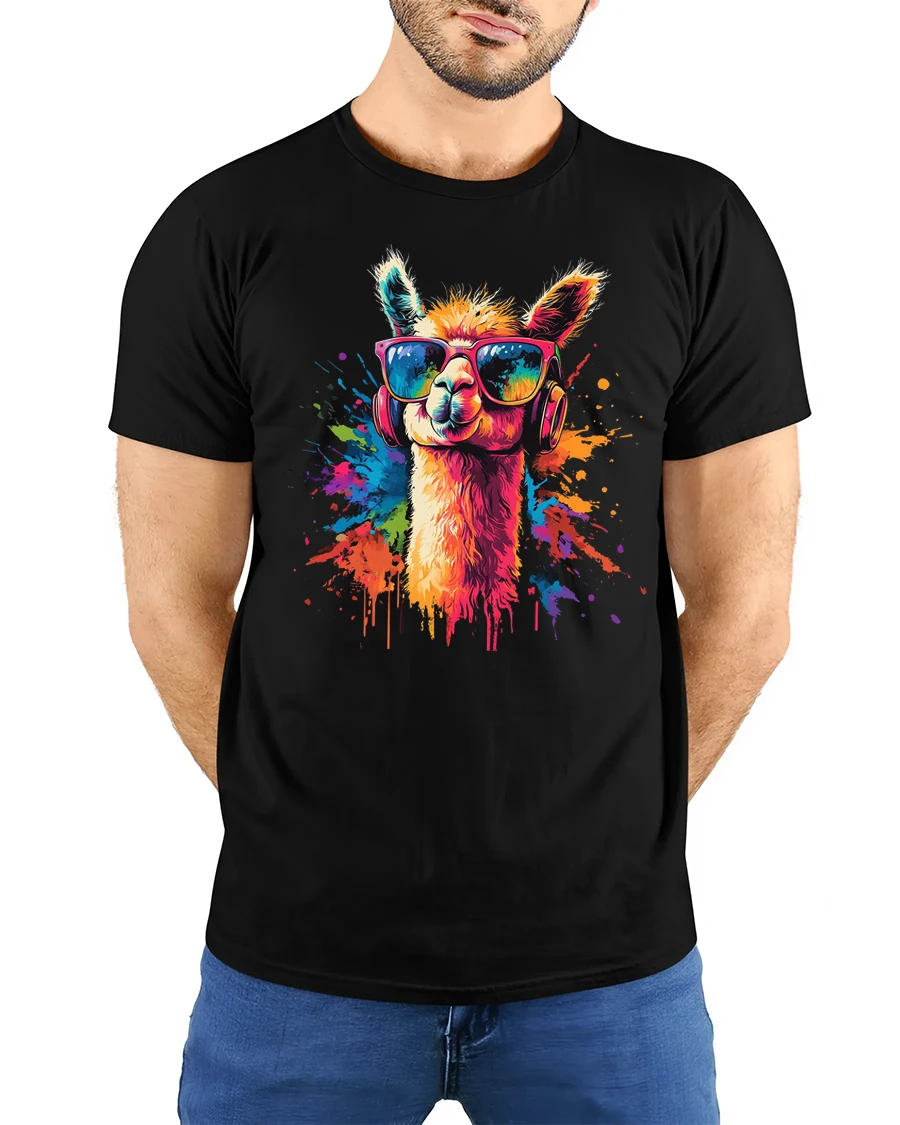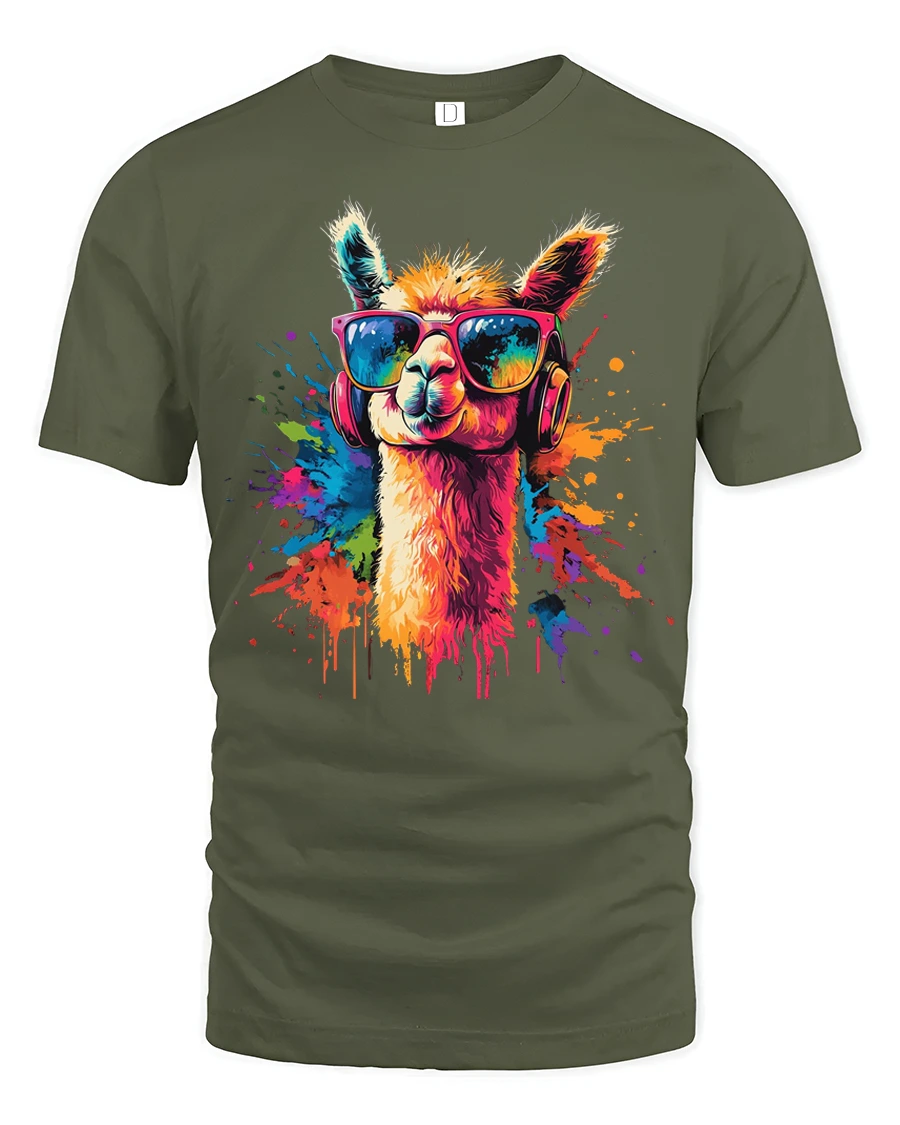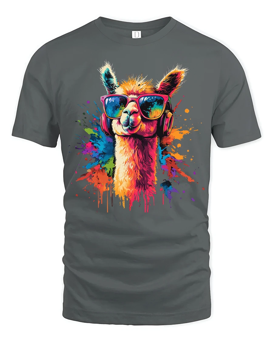 The artwork features a stylish llama wearing trendy sunglasses and headphones surrounded by bright paint splash colors that create a lively artistic look.