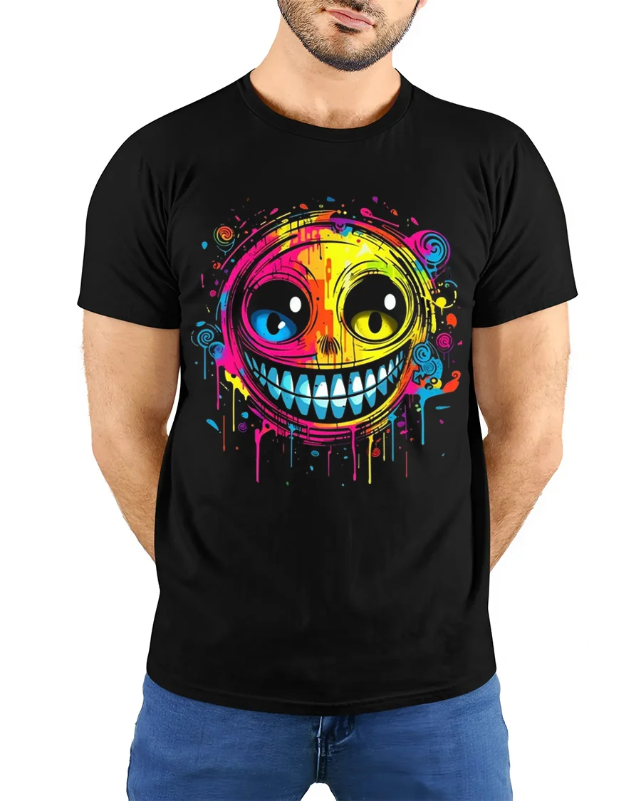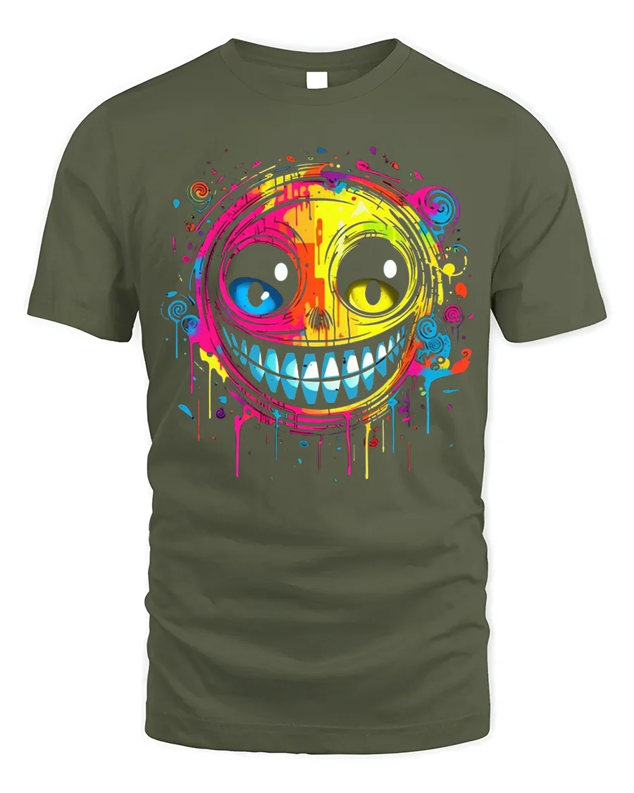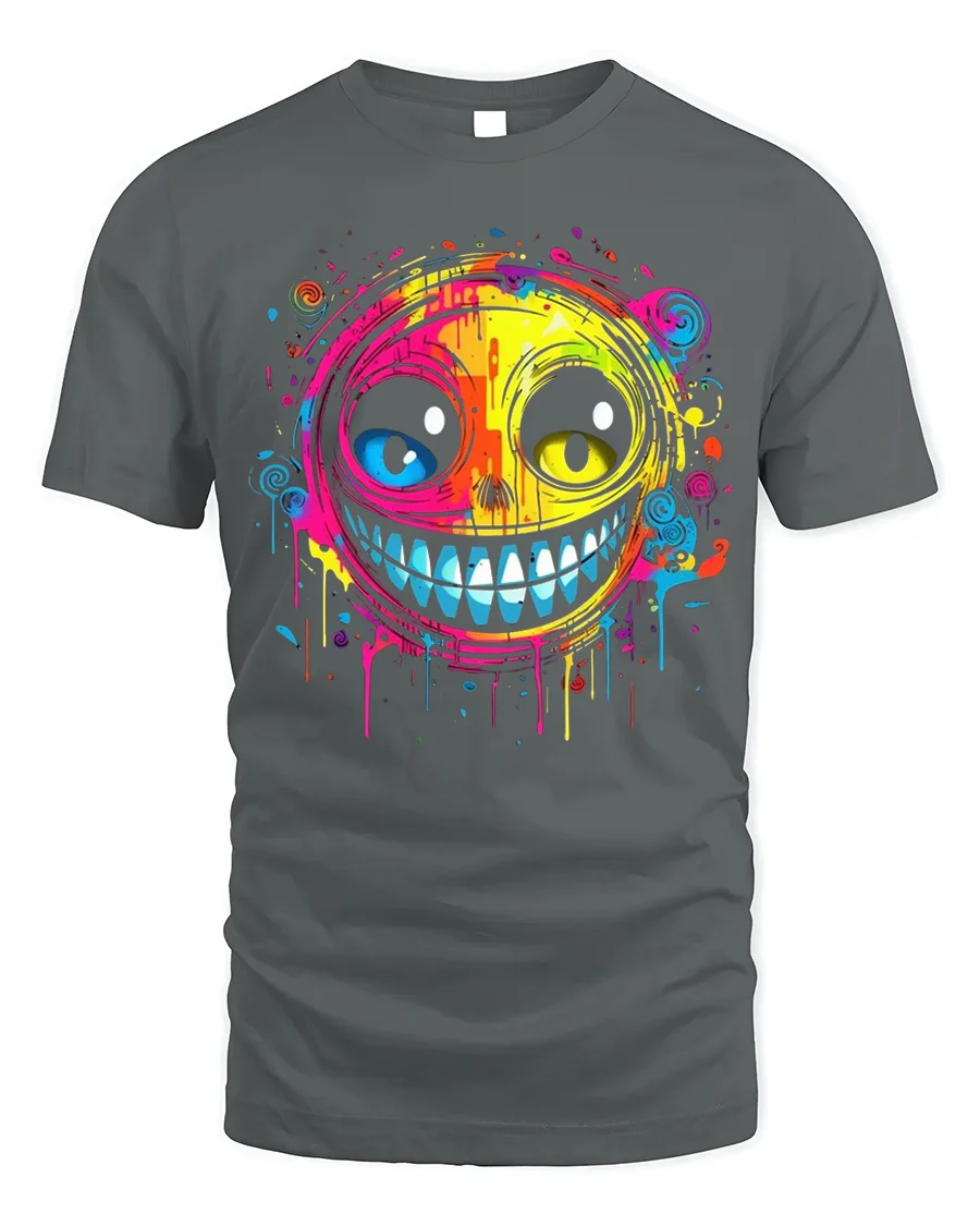 Make a bold and unforgettable statement with the Colorful Creepy Smiley Face Graphic T-Shirt Vibrant Art Tee. Featuring a wildly expressive smiley face with vivid neon paint splashes, this design blends creepy, artistic, and psychedelic vibes into one standout piece. The striking mix of yellow, pink, orange, and blue creates a chaotic yet captivating look that’s perfect for fans of edgy street art and bold graphic styles.