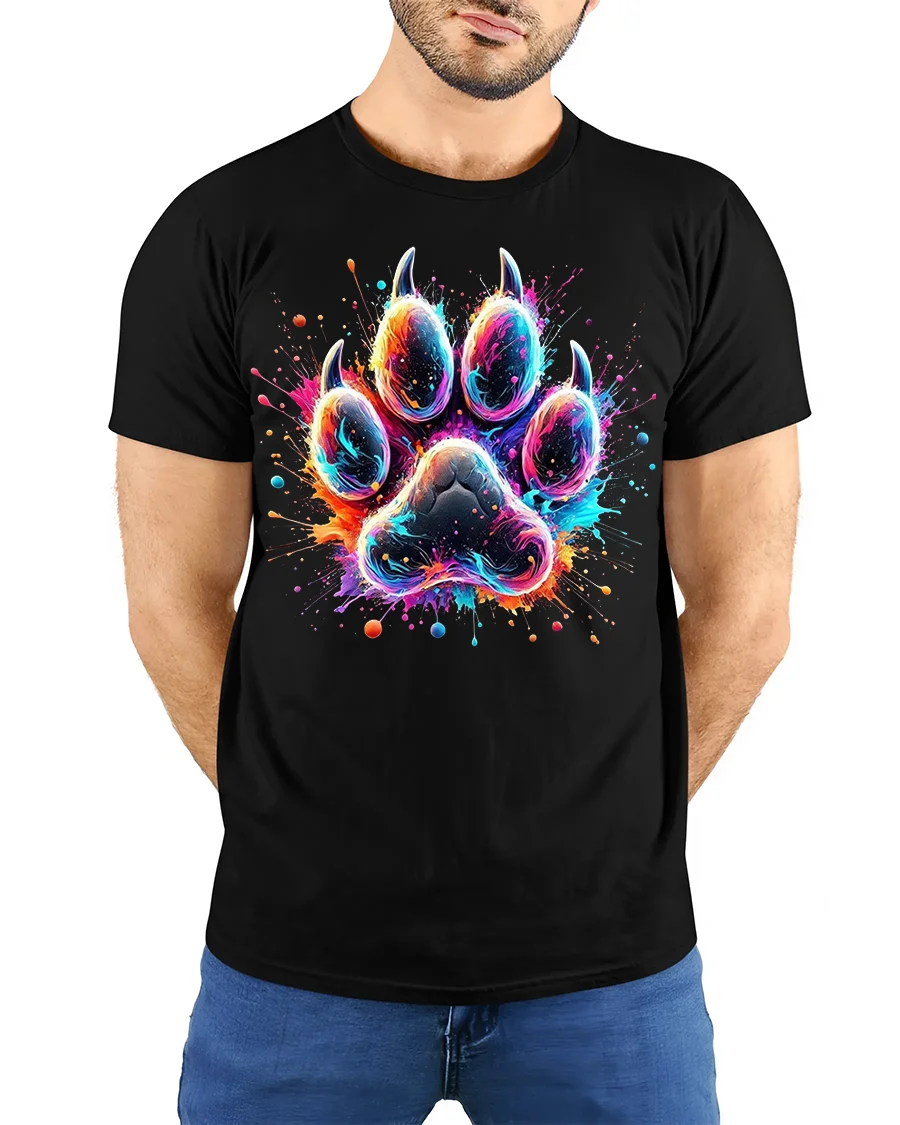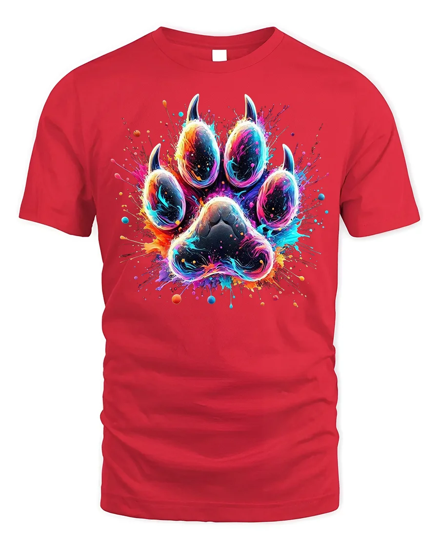 Colorful Paw Print Tshirt Vibrant Animal Art Tee is the perfect choice for pet lovers who want to express their love for animals in a bold and artistic way. This eye-catching t-shirt features a large paw print designed with a burst of vibrant rainbow colors and splash effects, making it stand out in any casual setting. The unique design reflects the bond between people and their pets, while also serving as a stylish statement piece.