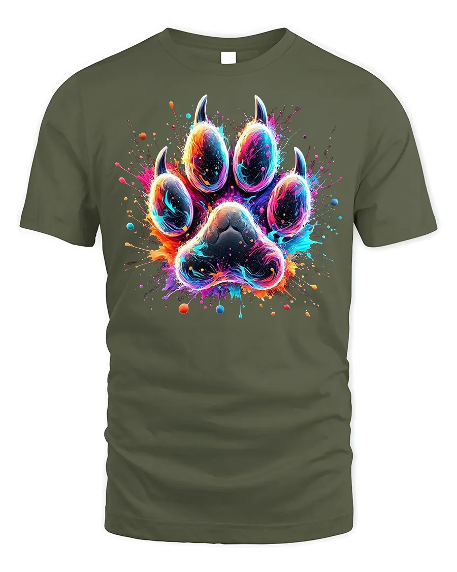 Colorful Paw Print Tshirt Vibrant Animal Art Tee - military green t-shirt on white background