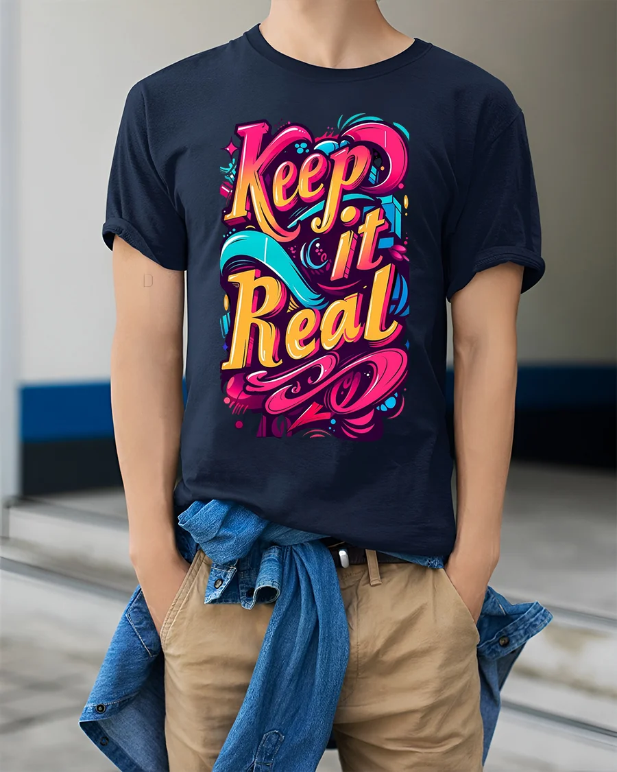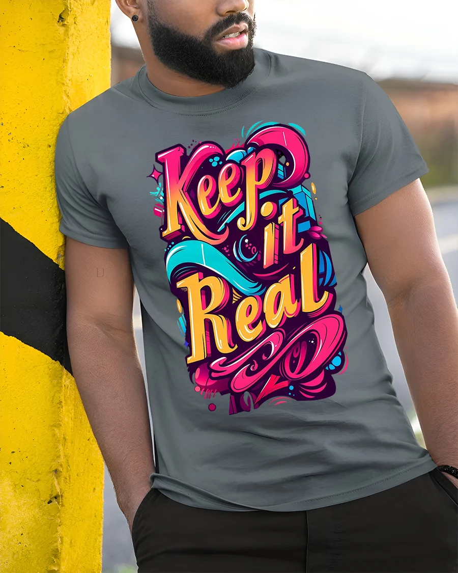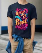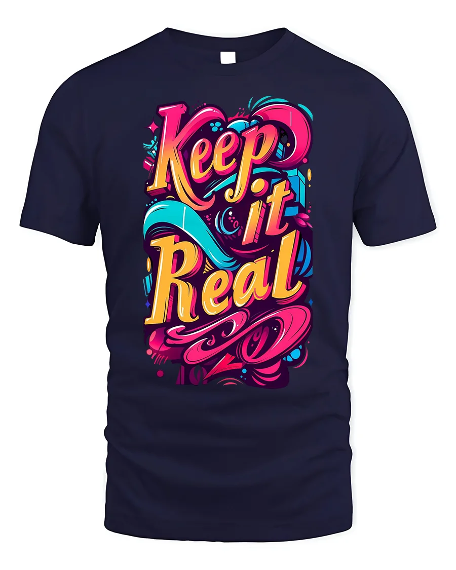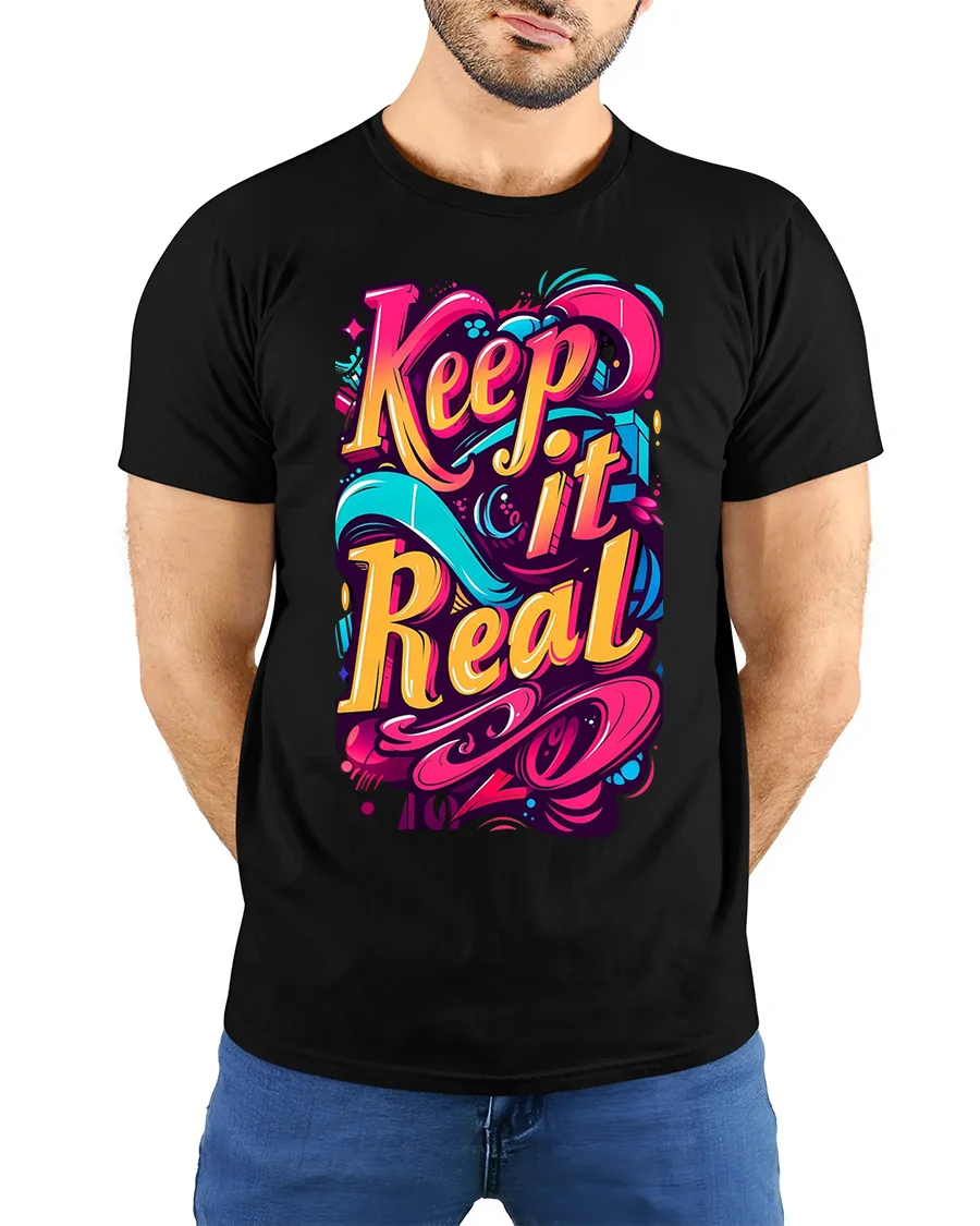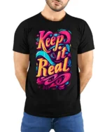 The Colorful Retro Keep It Real Typography T-Shirt is a must-have for fans of expressive fashion and motivational street style. Pair it with jeans, sneakers, or a denim jacket for a confident, effortlessly cool look that never fades.