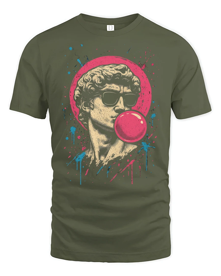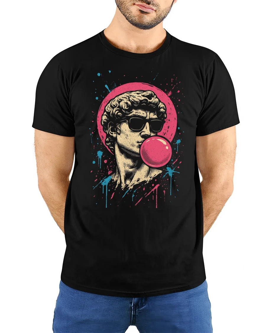 Cool Bubblegum David Statue Pop Art Graphic T Shirt blends classical art with modern street style to create a bold and creative design. Featuring a stylized David statue wearing sunglasses and blowing a bright bubblegum bubble, the artwork transforms a timeless sculpture into a playful pop art statement. The vibrant paint splashes and retro color accents give the design a contemporary artistic vibe that stands out instantly.