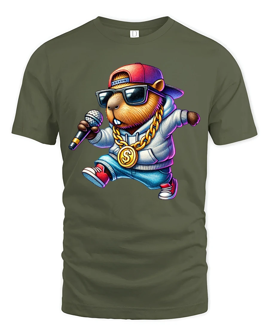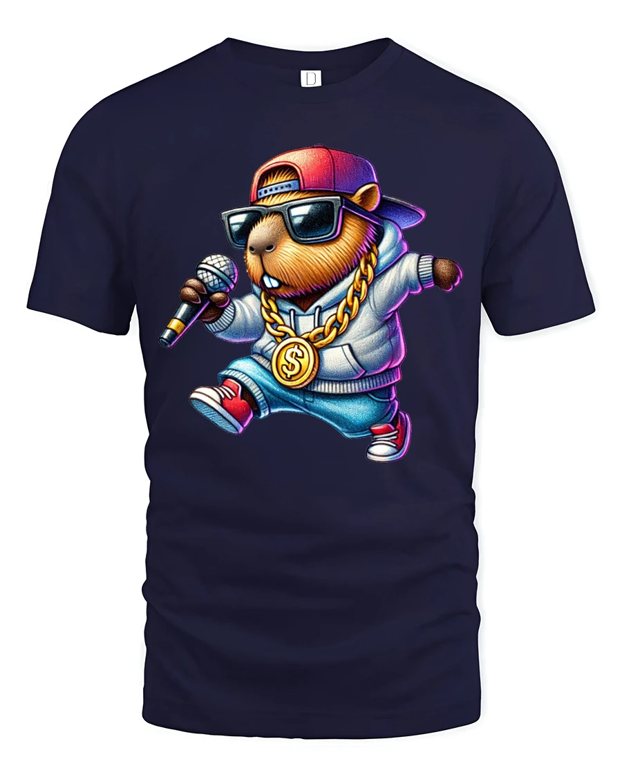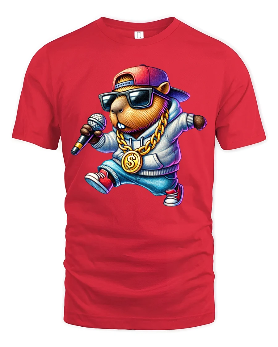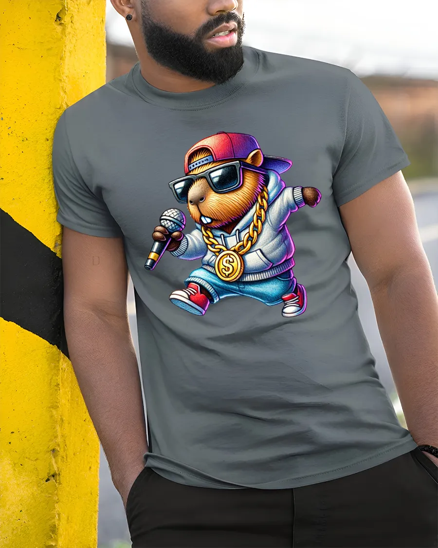 Cool Capybara Rapper Graphic Tee Street Music Vibe Tshirt combines humor and urban music culture into a bold and eye catching design. The confident capybara character wearing stylish accessories and holding a microphone delivers playful personality while celebrating creativity and rhythm inspired fashion. This fun illustration creates a lively visual that expresses individuality and positive attitude.