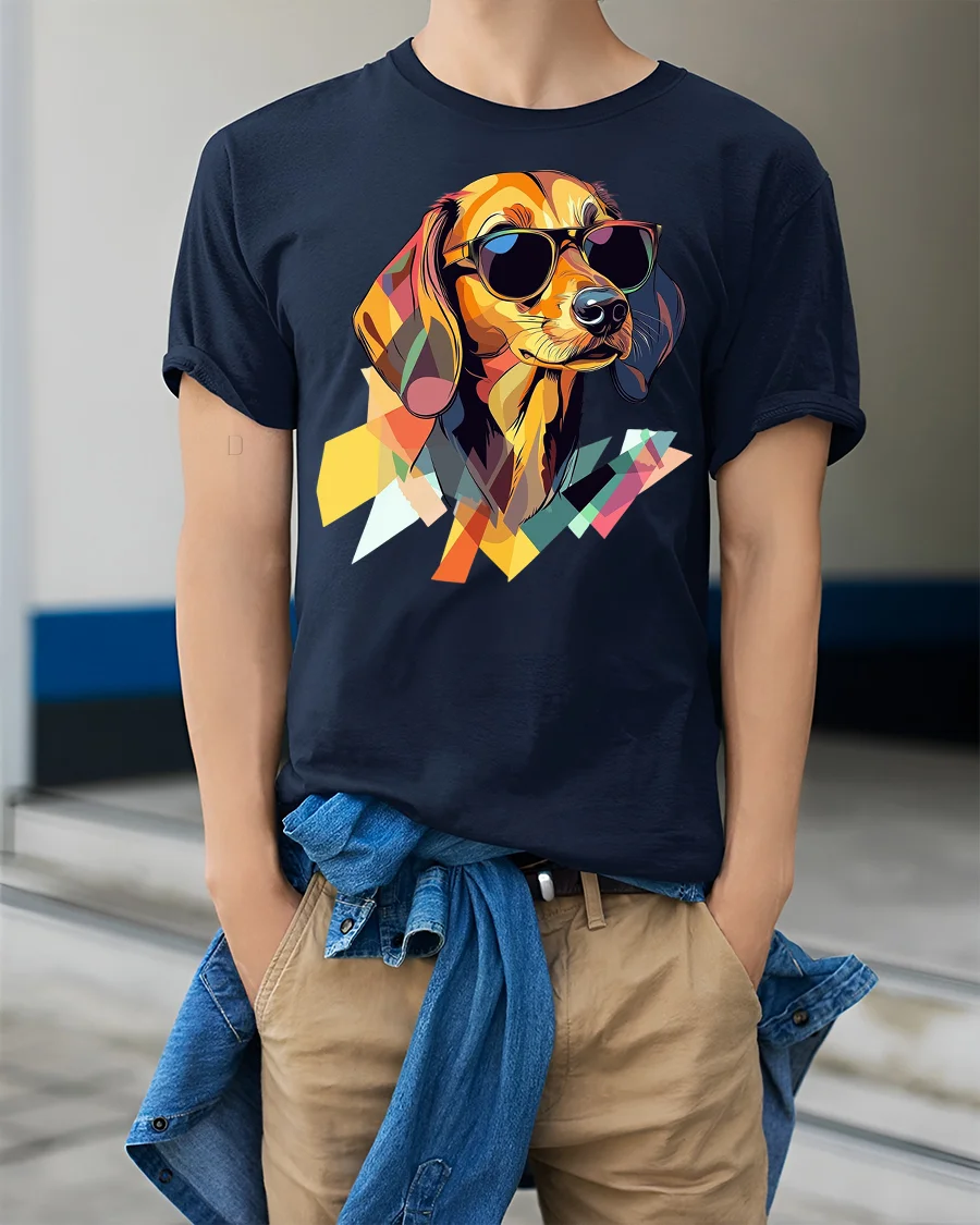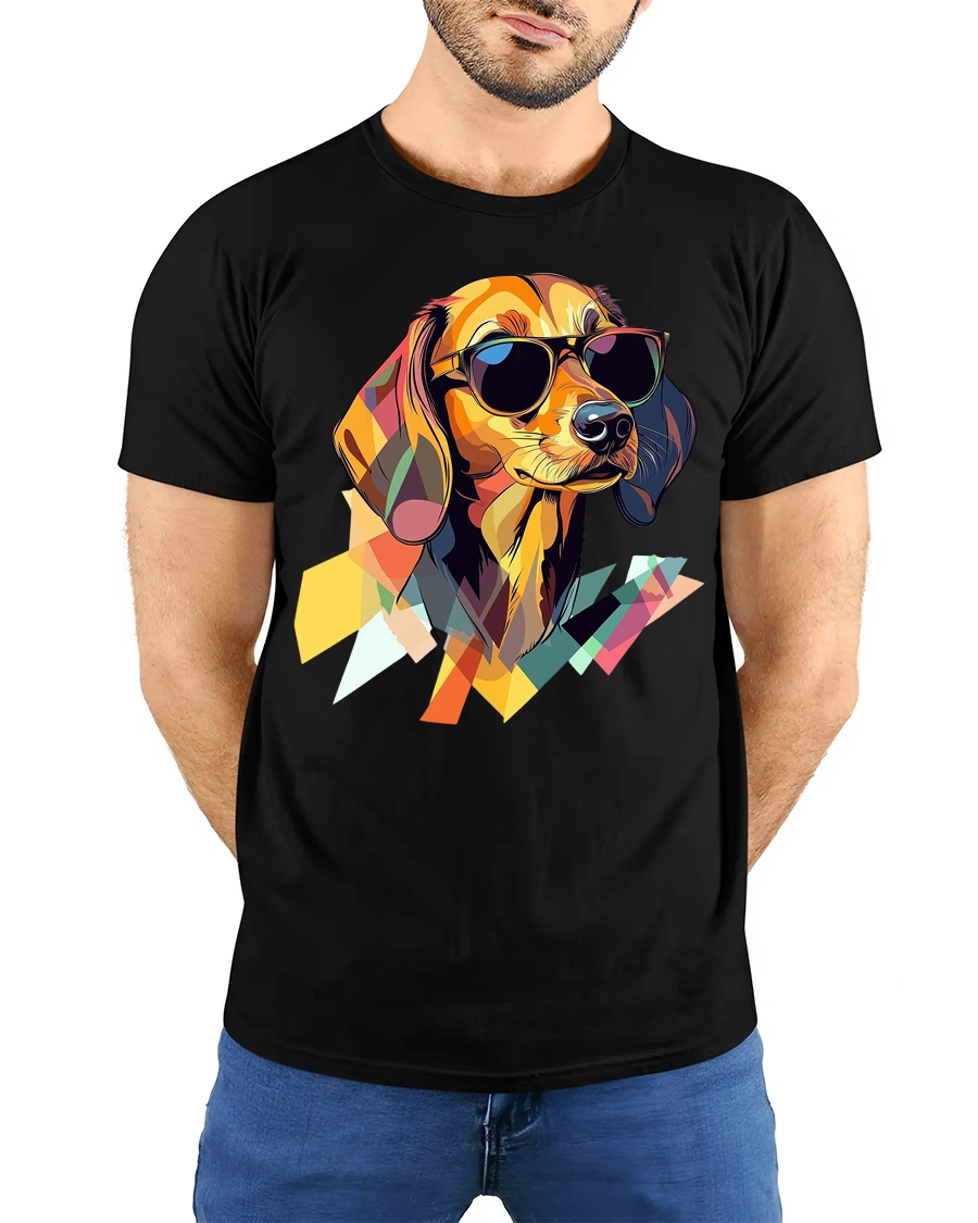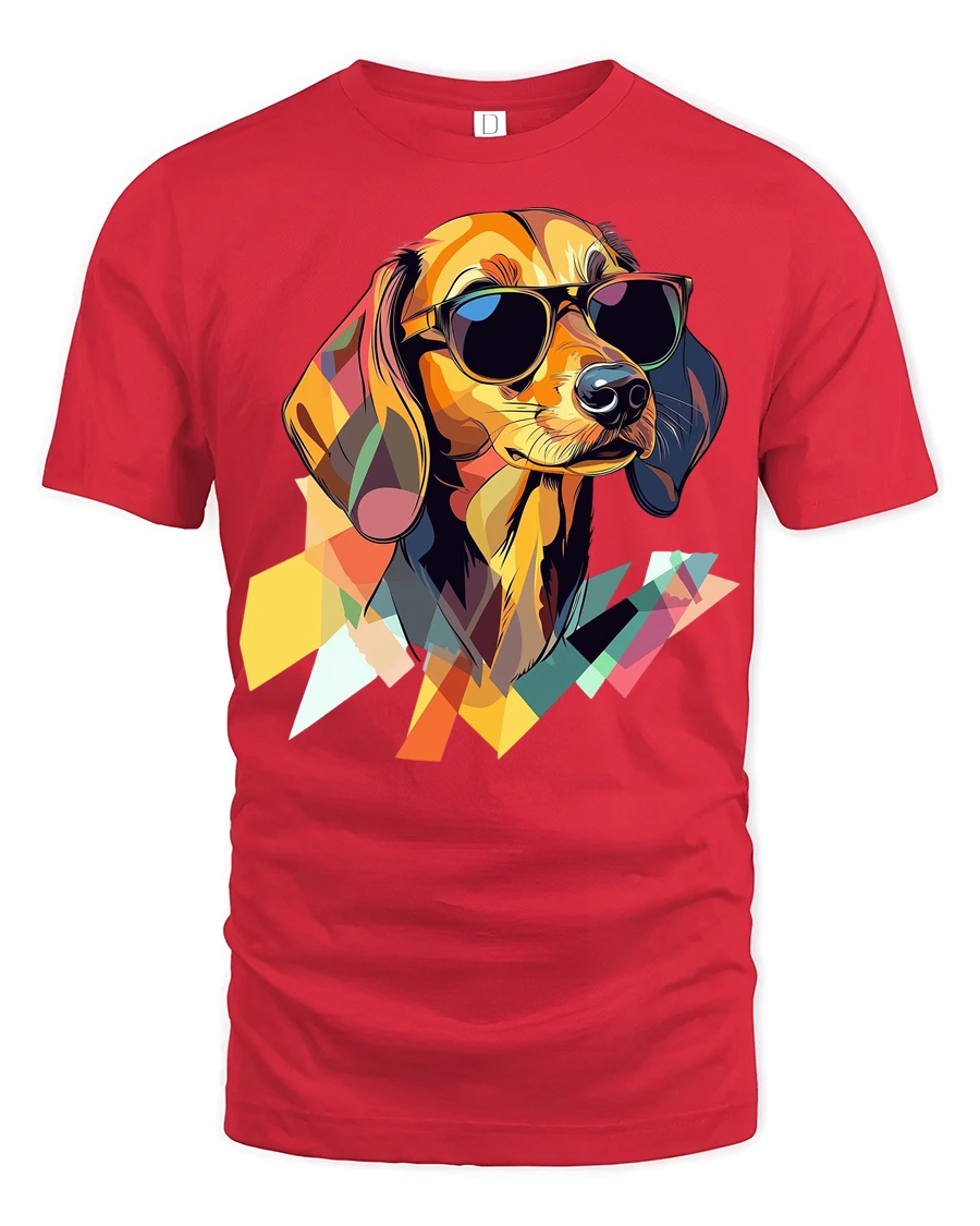 Featuring a stylish dachshund wearing sunglasses with bold colorful shapes, this design combines modern art with a fun and relaxed vibe.
