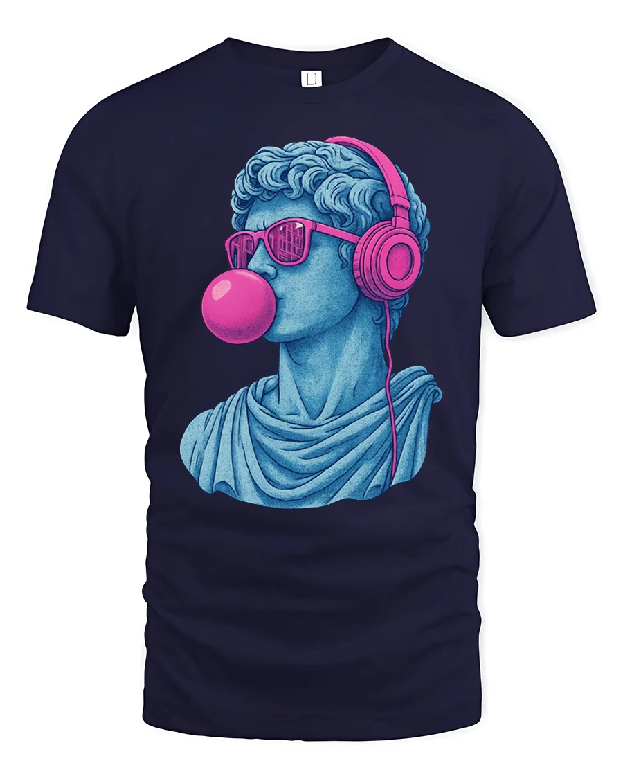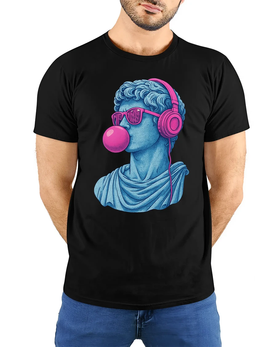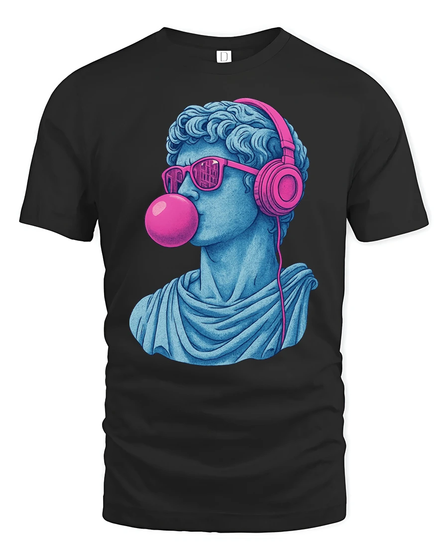 Cool David Statue With Headphones Bubblegum Pop Art T Shirt blends classical art inspiration with playful modern style. The design features a stylized David statue wearing bright headphones and sunglasses while blowing a bubblegum bubble, creating a creative mix of ancient sculpture and contemporary pop culture. The bold colors and artistic contrast give the design a unique pop art aesthetic that instantly catches attention.