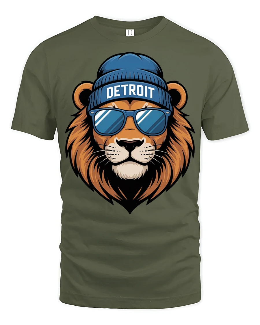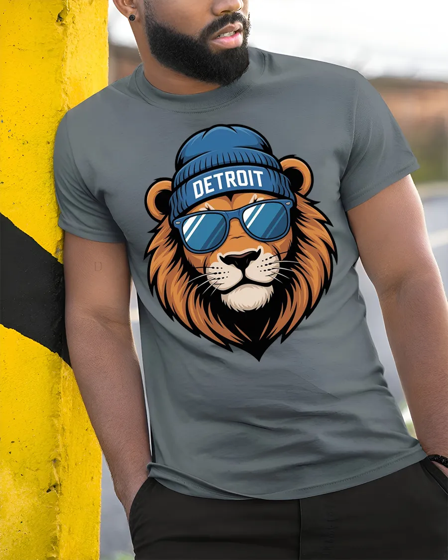 The artwork showcases a confident lion wearing sunglasses and a beanie with Detroit lettering, giving the design a cool and stylish personality.