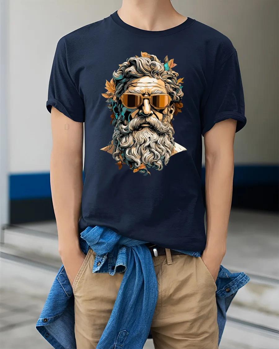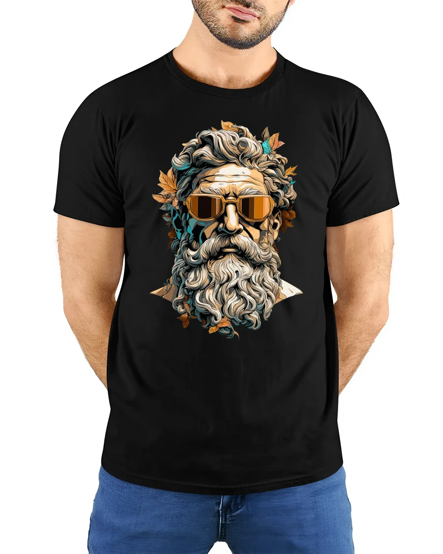 The detailed bearded god portrait paired with sleek sunglasses creates a unique fusion of classic art and contemporary attitude.