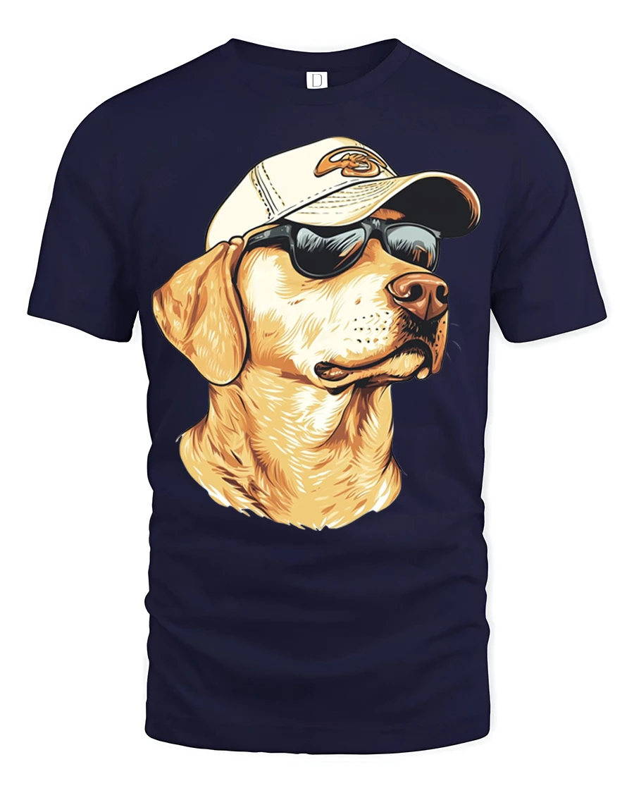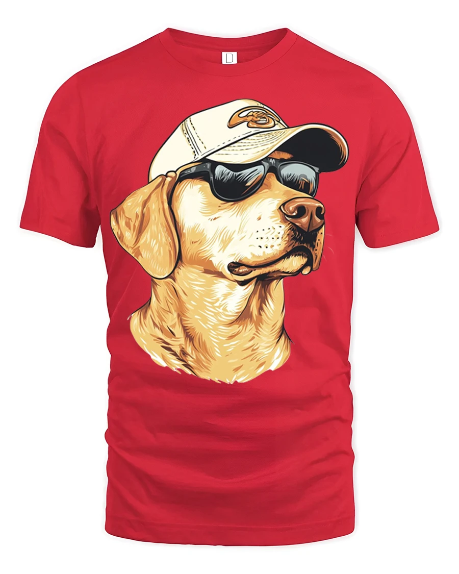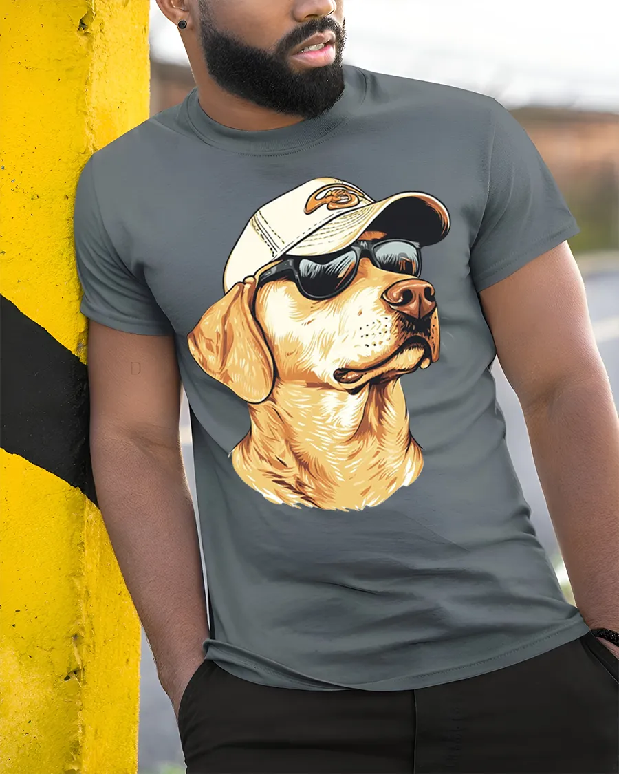 The design features a confident Labrador retriever wearing sunglasses and a cap, creating a fun and relaxed look that instantly catches attention.