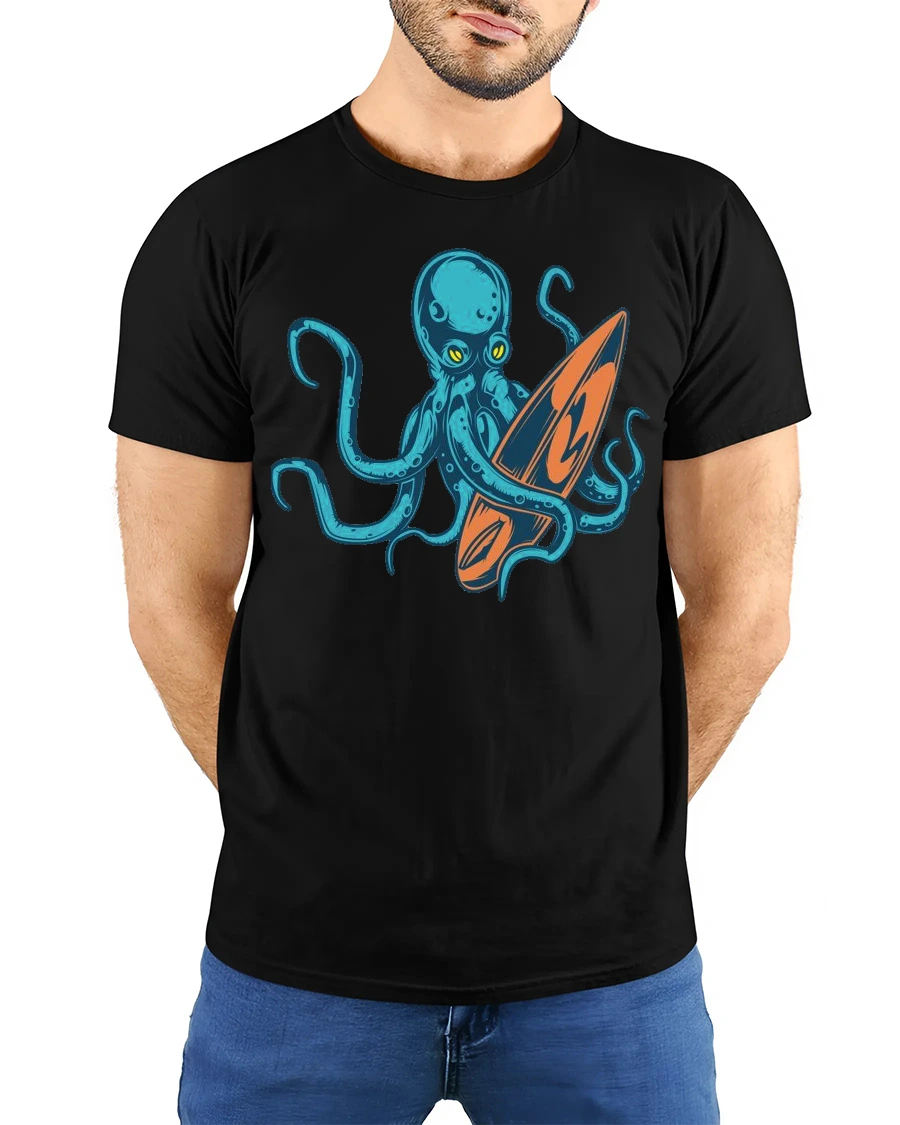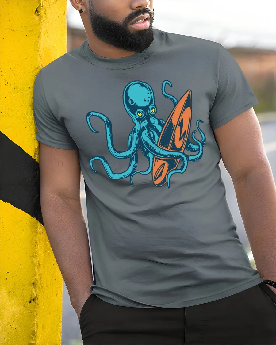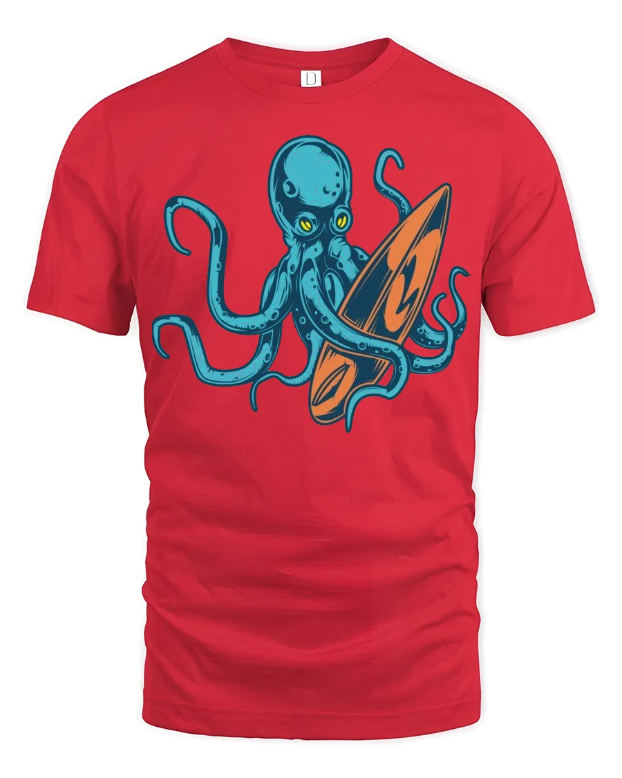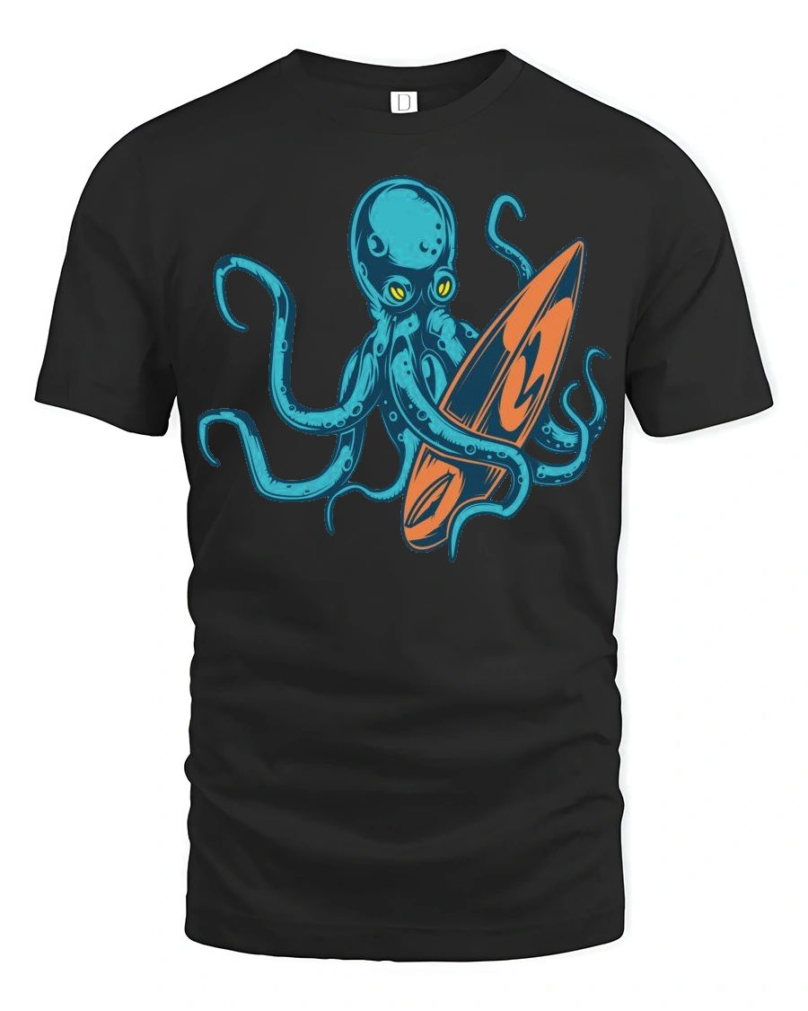 Cool Octopus Surfboard Beach Wave Graphic Tee Design delivers a fun and creative twist on classic beach style with a unique ocean inspired design.