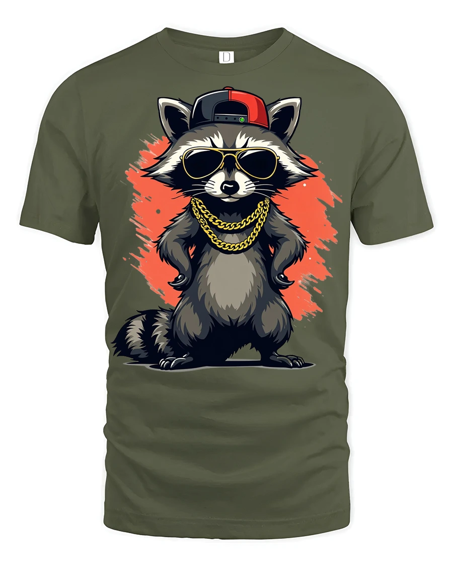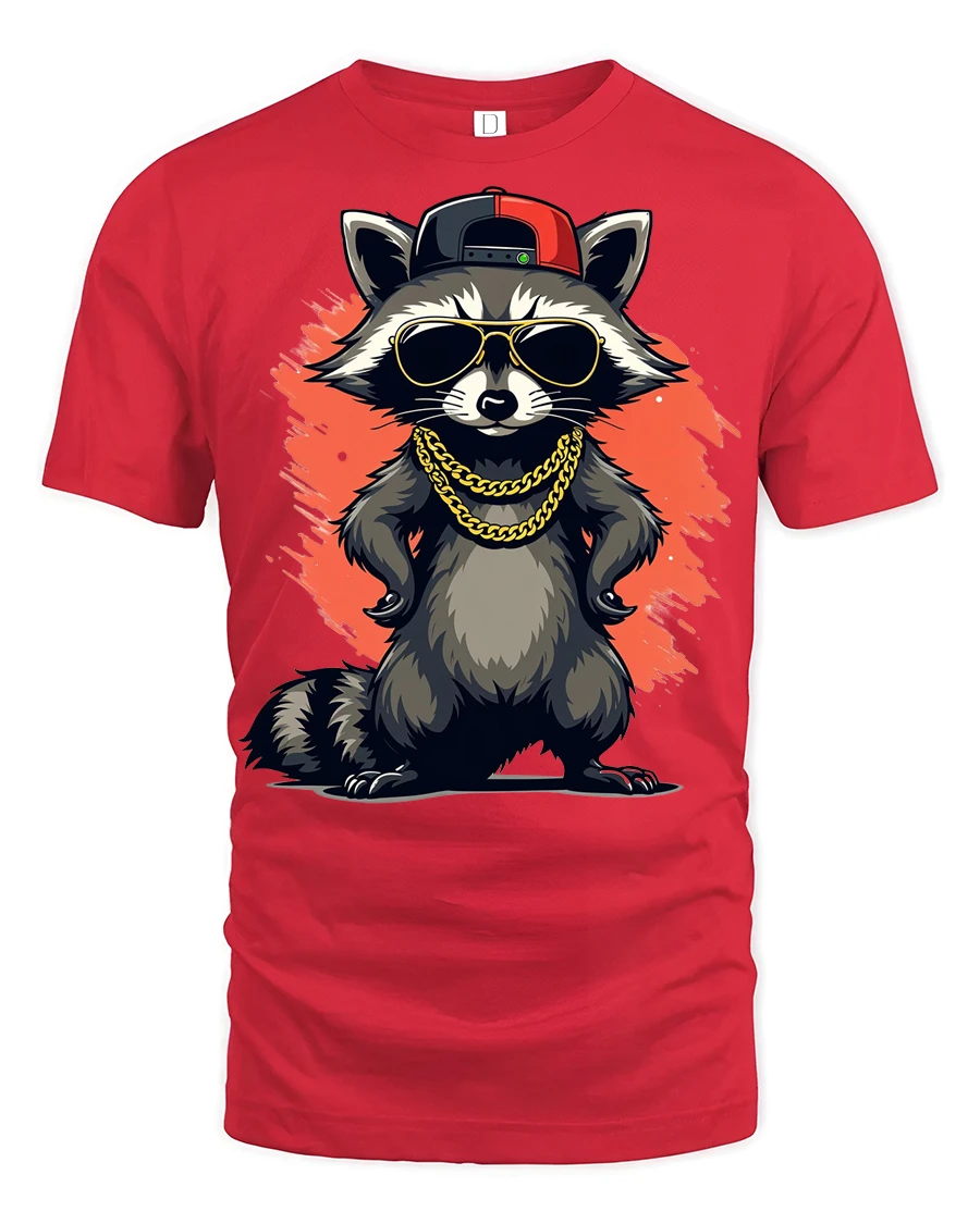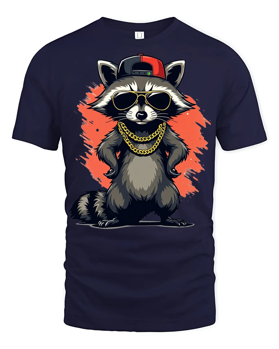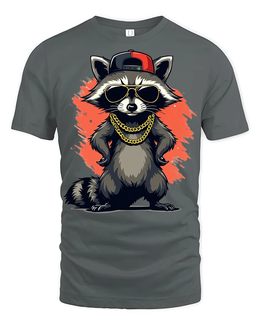 Featuring a confident raccoon rocking sunglasses, a cap, and chains, this graphic captures the energy of hip hop culture with a fun twist.