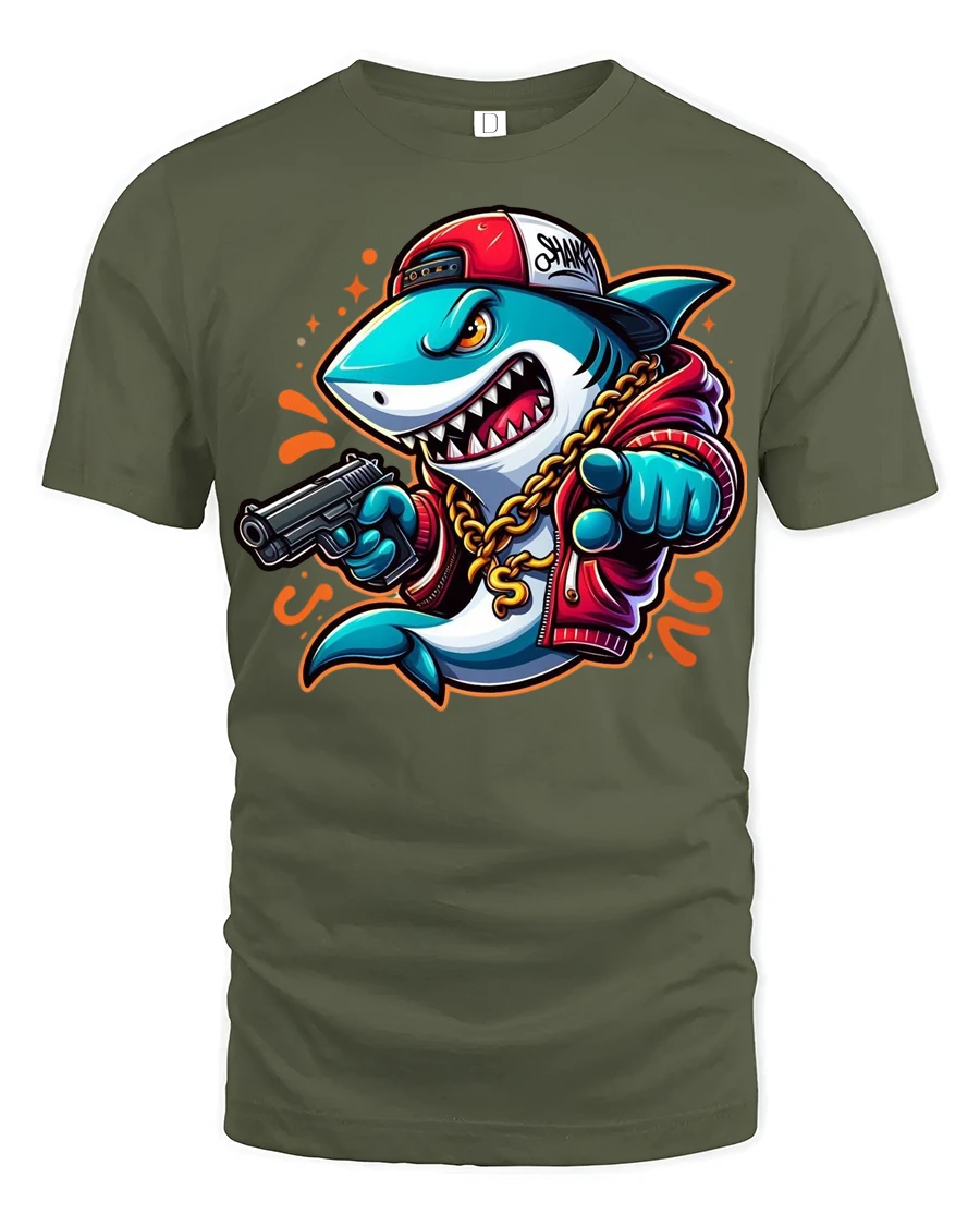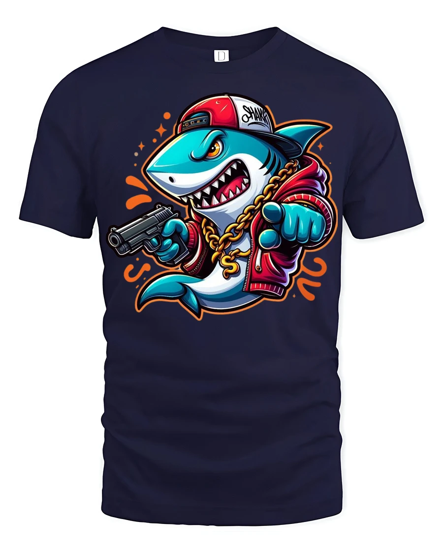 The design features a fierce shark dressed in hip hop fashion with chains and attitude, creating a unique mix of humor and urban style.