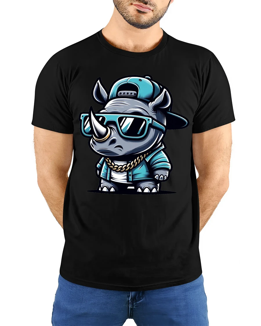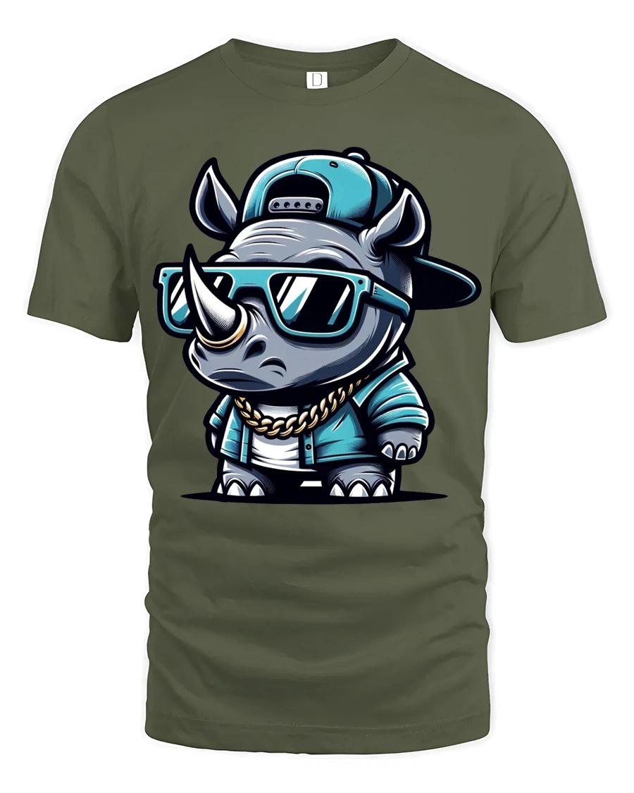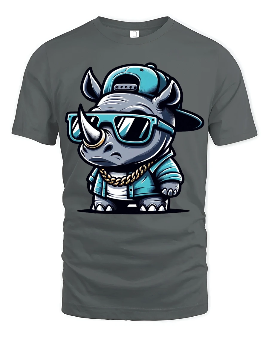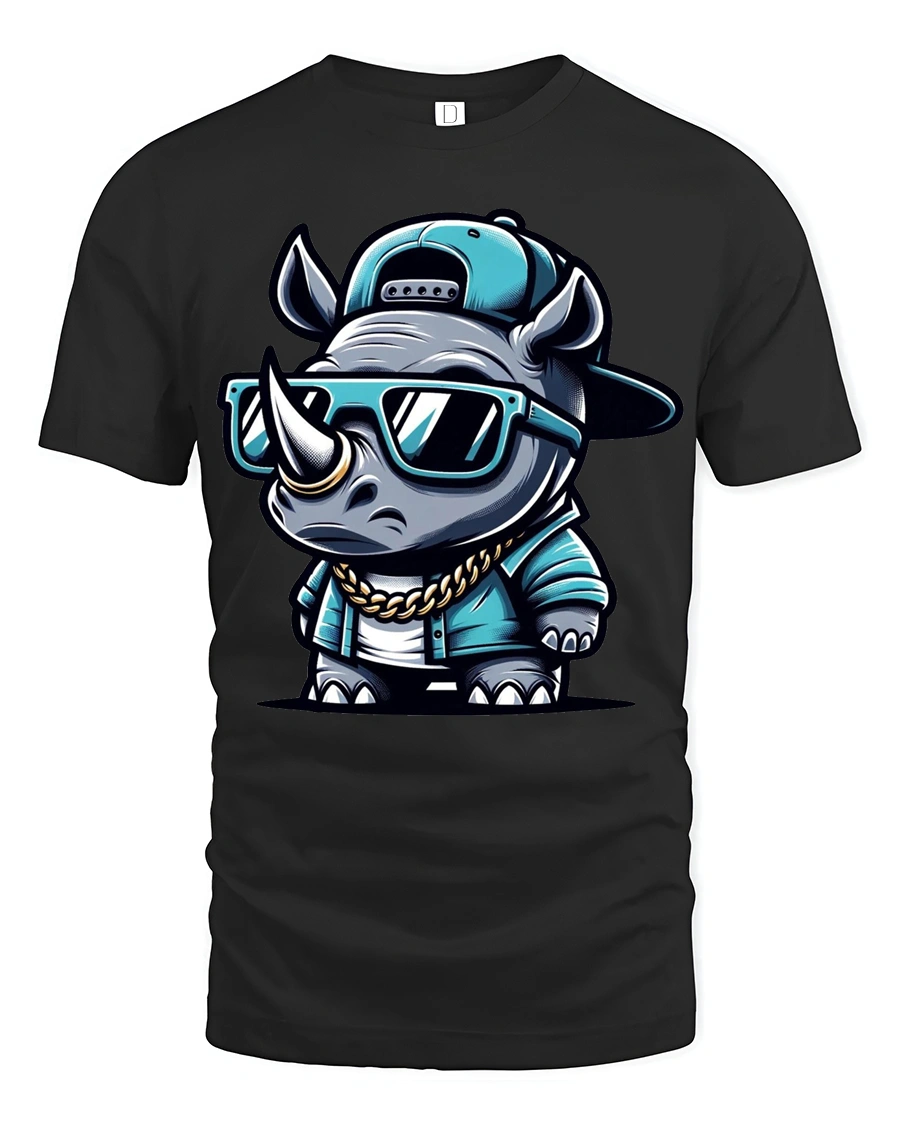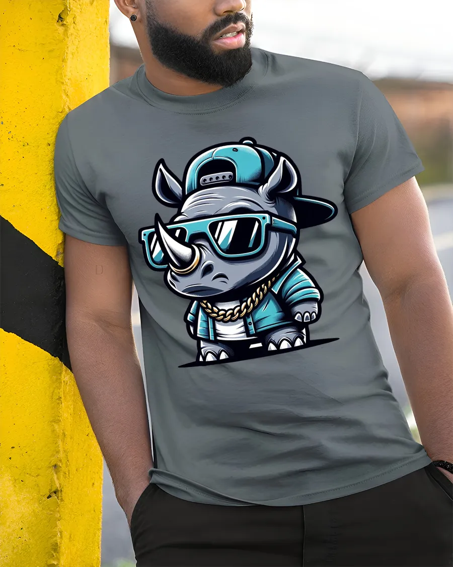 The design features a confident rhino rocking sunglasses, a cap, and a chain, creating a fun and eye catching urban vibe.