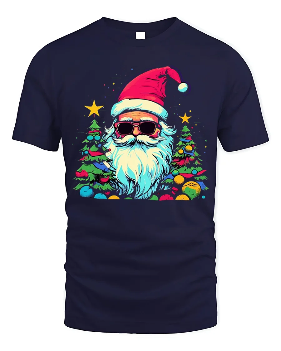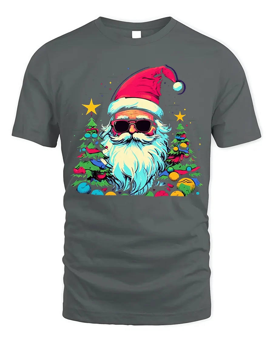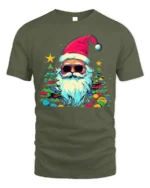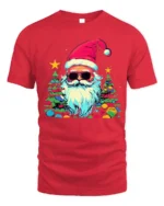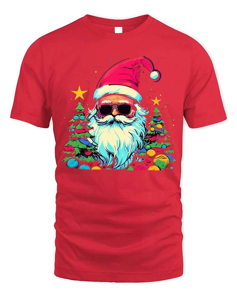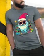 Celebrate the holiday season in style with the Cool Santa With Sunglasses Christmas Tree Graphic T-Shirt. This fun and festive tee captures the cheerful spirit of Christmas with a modern twist, featuring a stylish Santa wearing shades surrounded by vibrant Christmas trees and colorful ornaments. Designed to spread joy and cool vibes, it’s the perfect pick for anyone who loves standing out during the holidays.