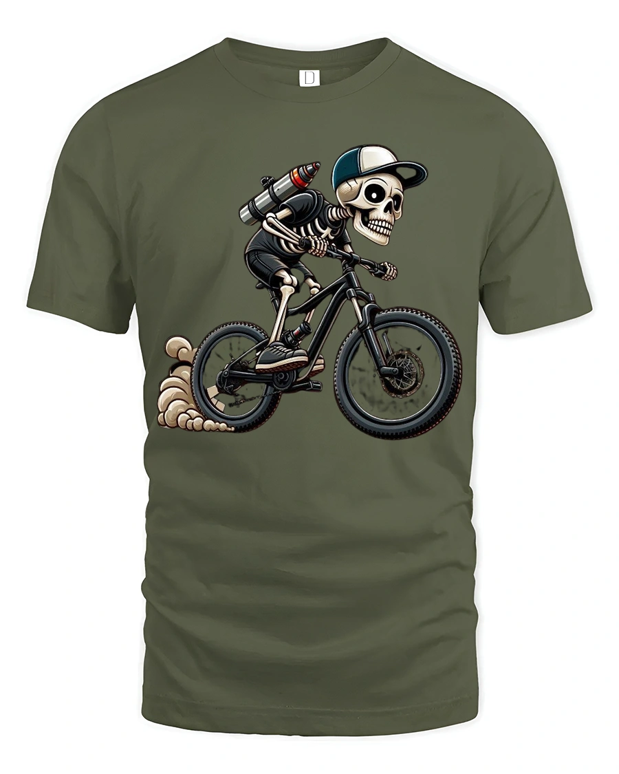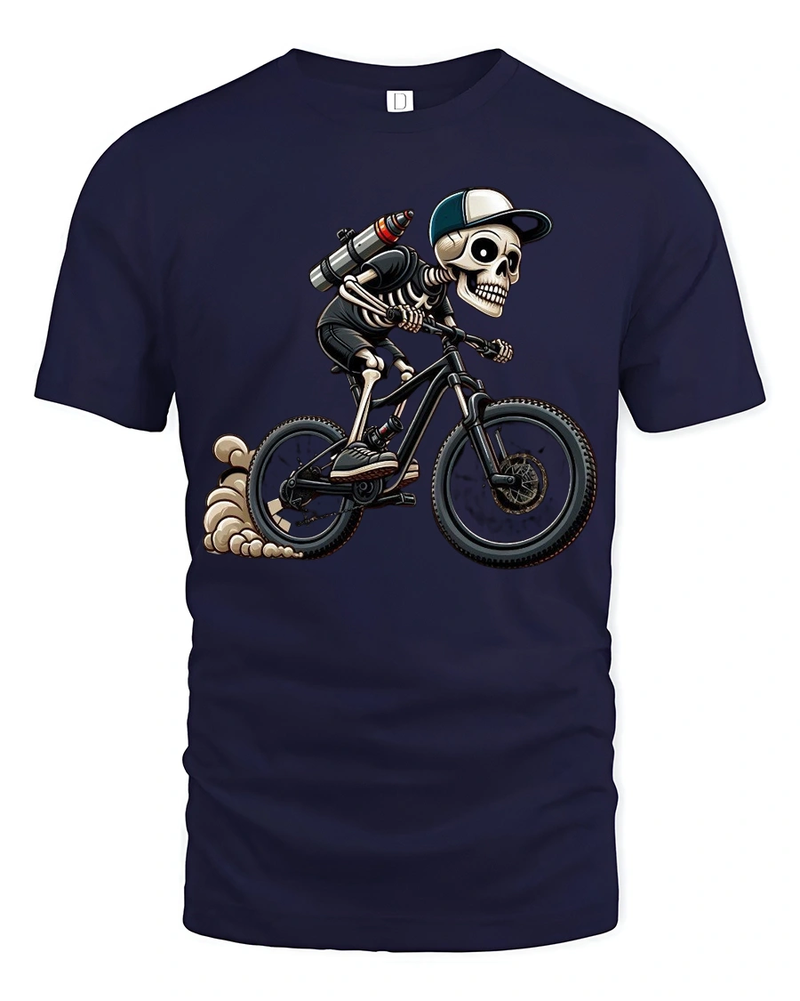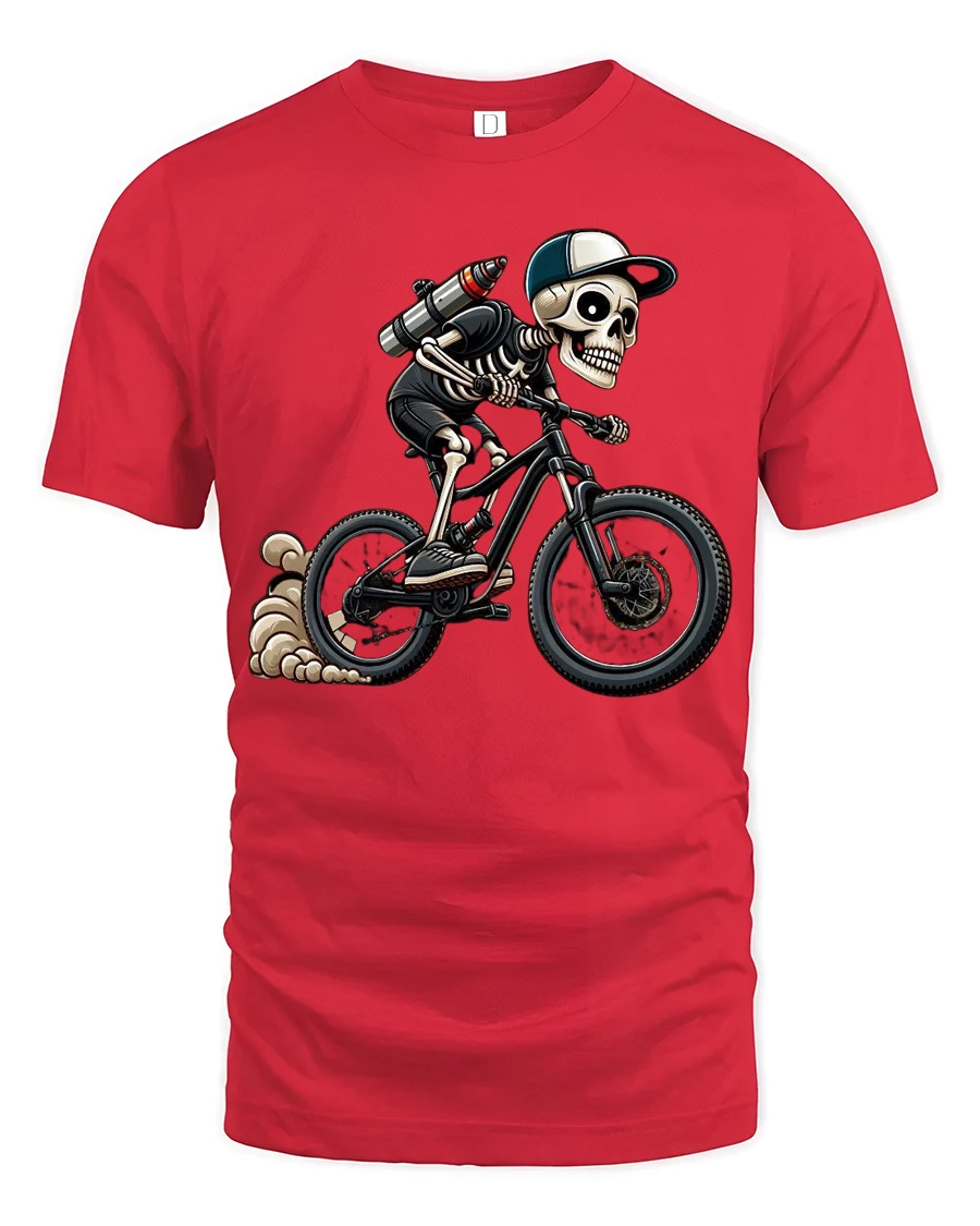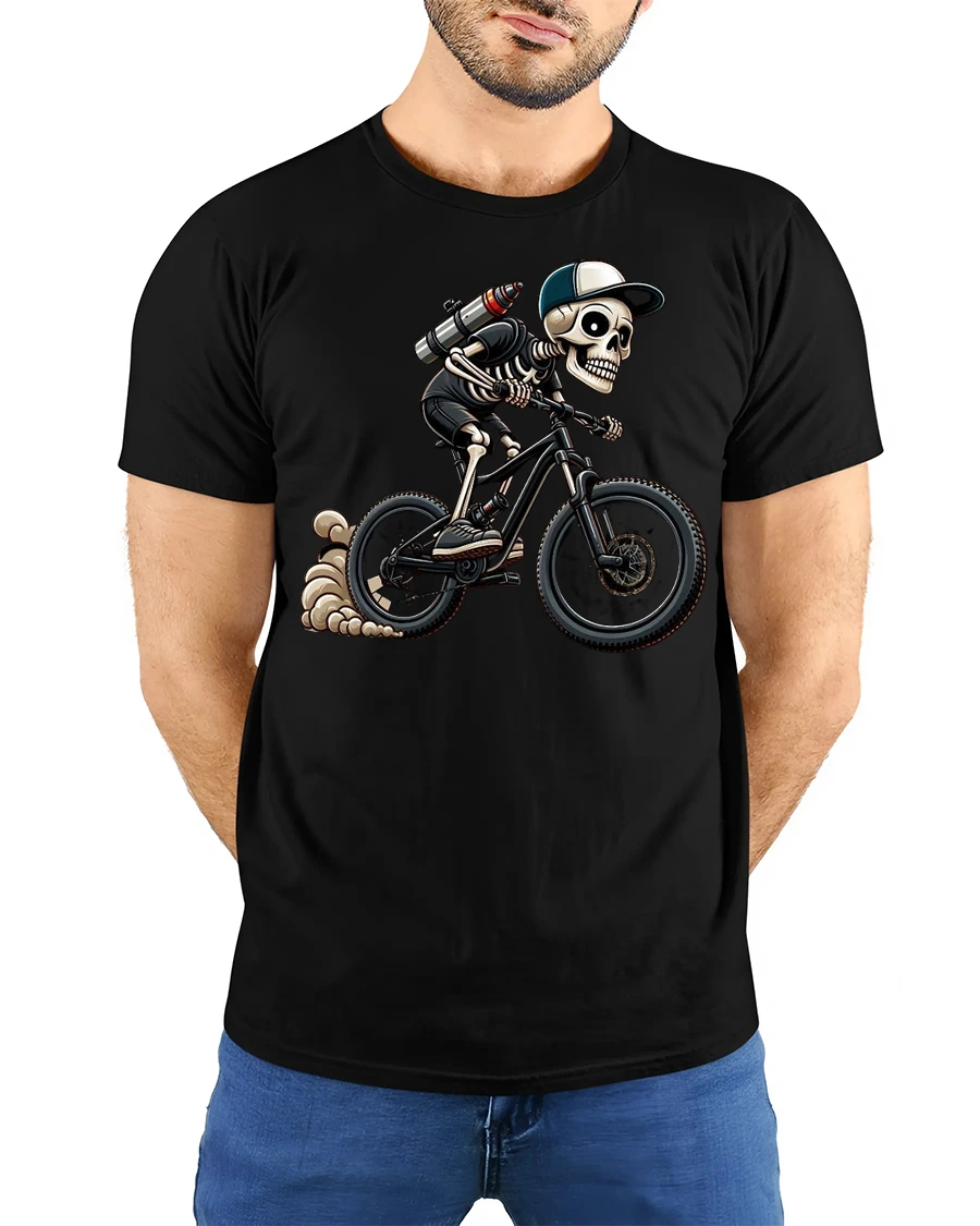 Cool Skeleton Riding Bike Graphic T Shirt Gothic Sport Style Tee blends bold humor with edgy illustration style, creating a striking visual that stands out instantly. The detailed skeleton cyclist design captures motion and adventure while adding a playful gothic twist that makes the artwork both unique and expressive. The dynamic composition brings personality into casual fashion with a confident and creative vibe.