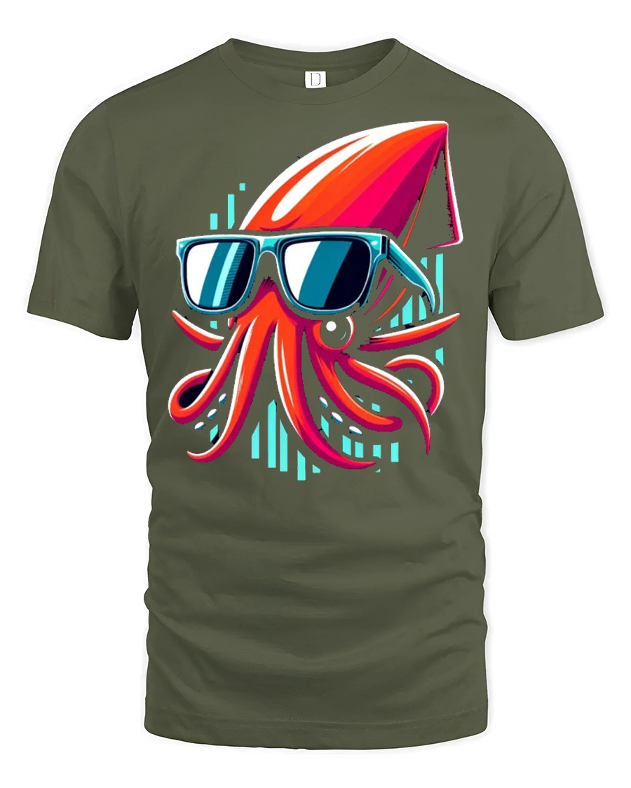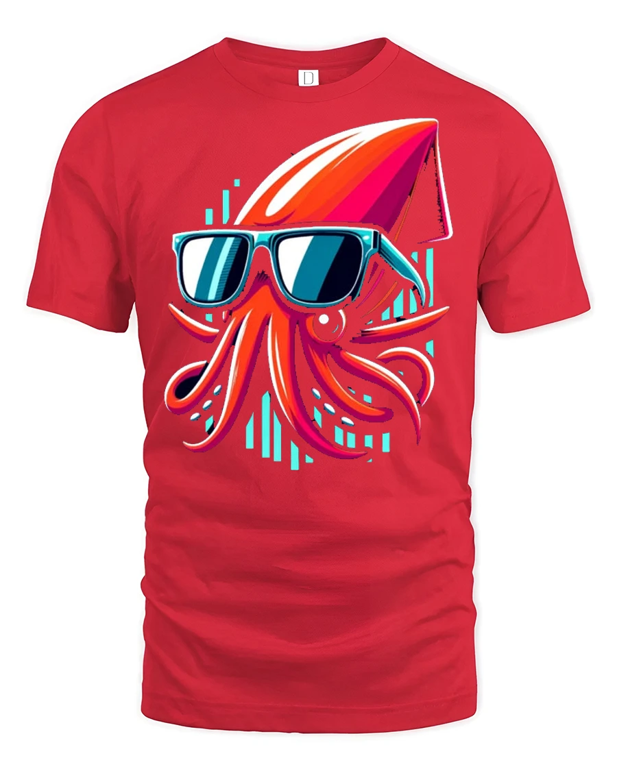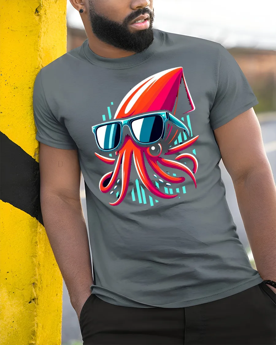 The design features a bold and colorful squid rocking stylish sunglasses, creating a fun and modern visual that stands out instantly.