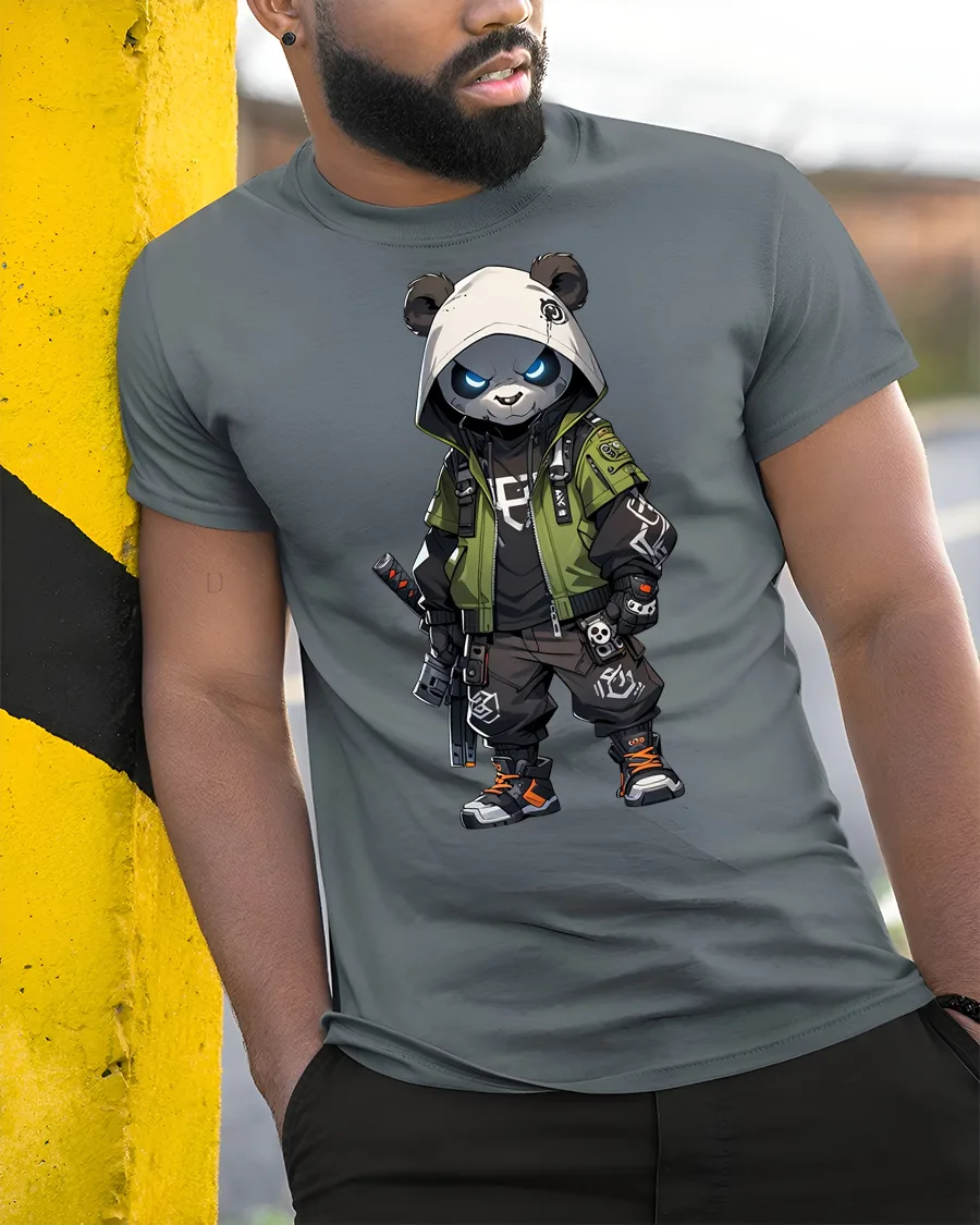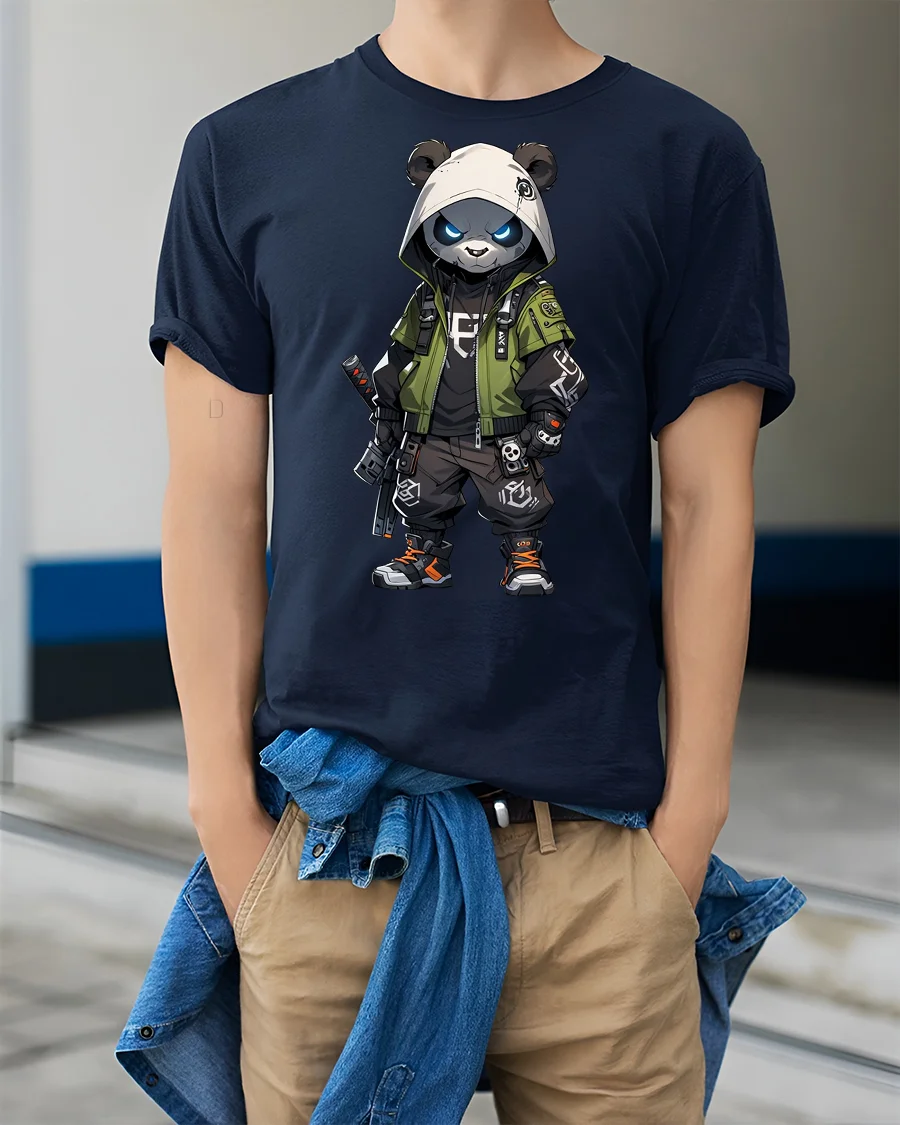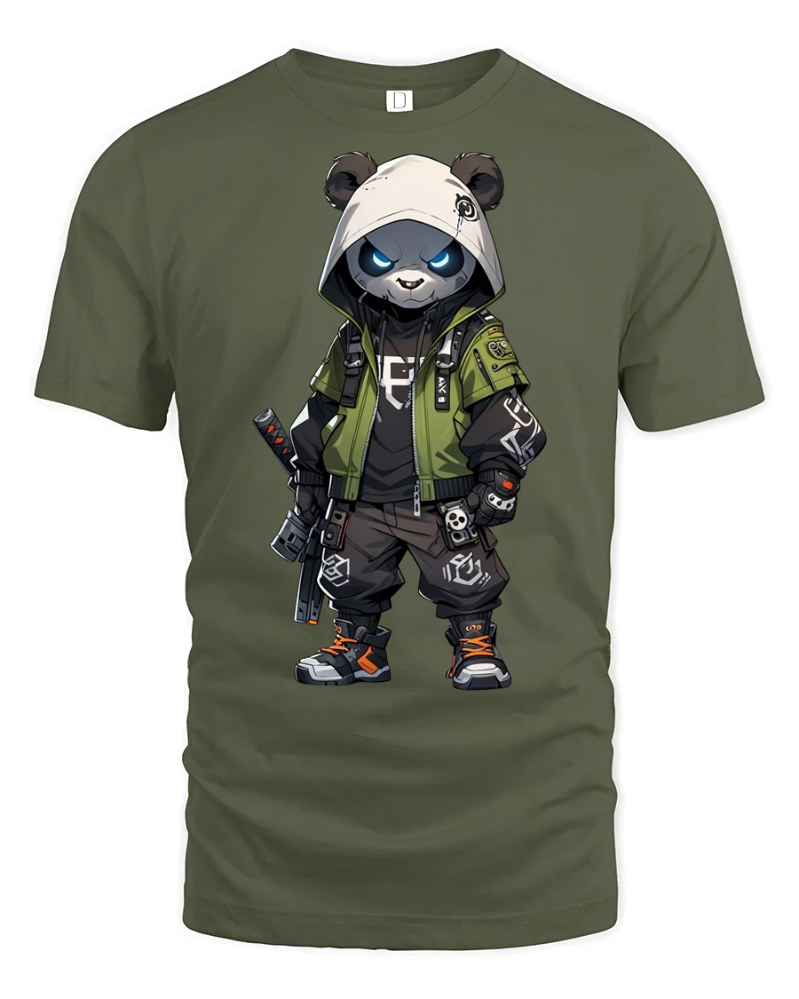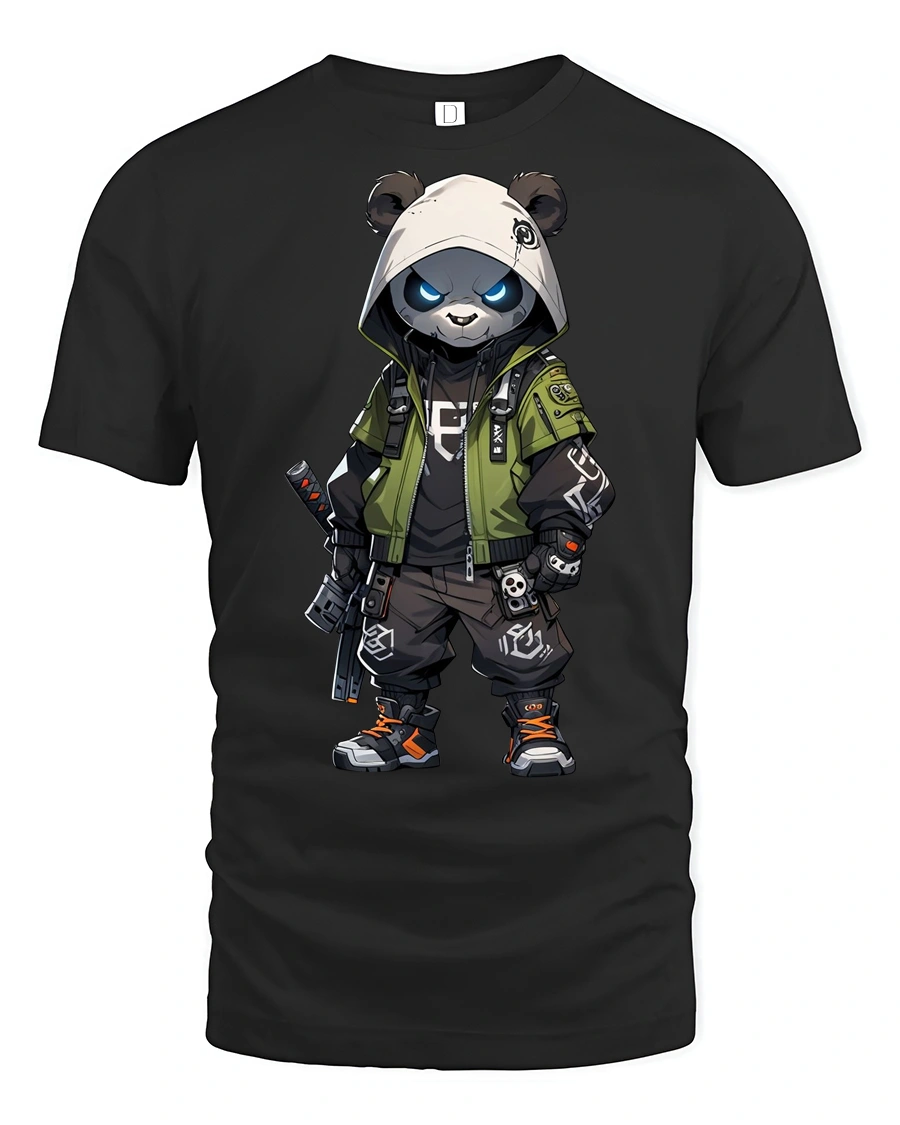 Featuring a fierce panda dressed in tactical gear with a hood and weapon details, this graphic delivers a strong streetwear vibe with anime inspired elements.