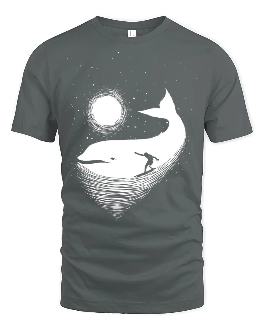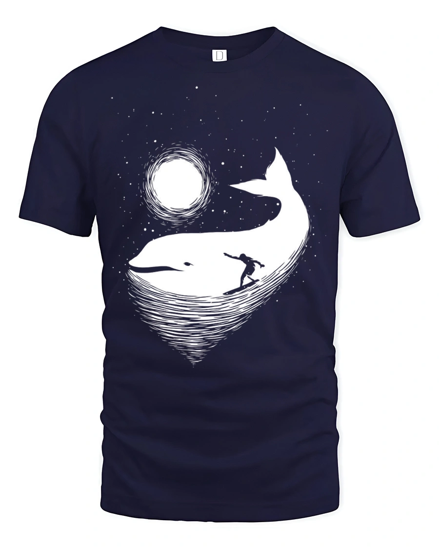 Designed with a surreal artistic approach, this whale graphic tee presents a balanced composition that highlights elegance and creative storytelling through minimal yet meaningful visual elements. The flowing lines of the ocean and the gentle silhouette of the whale provide a harmonious aesthetic that complements modern casual fashion. The imaginative concept adds personality while maintaining a refined artistic style.