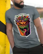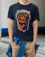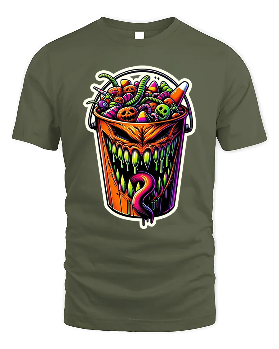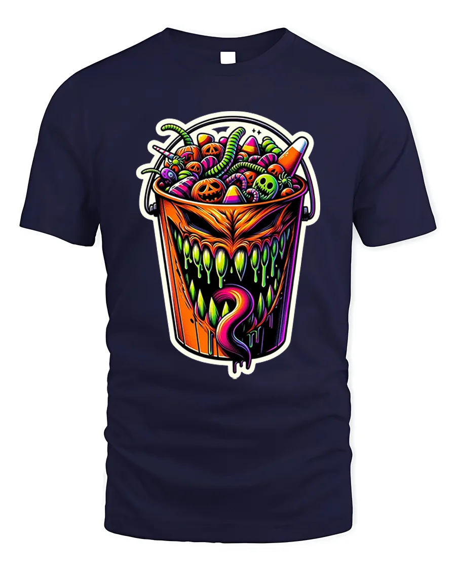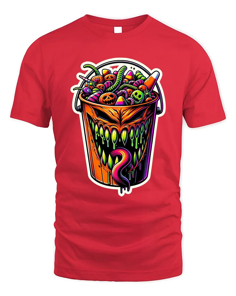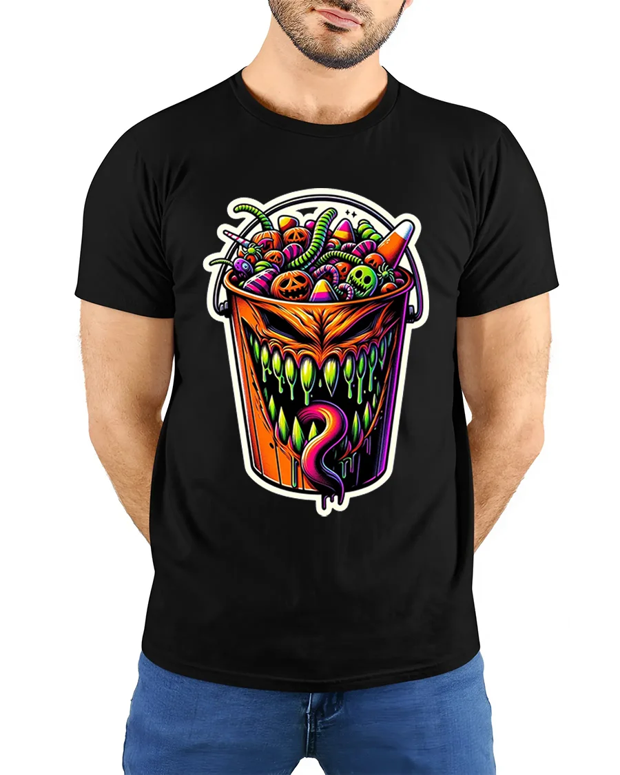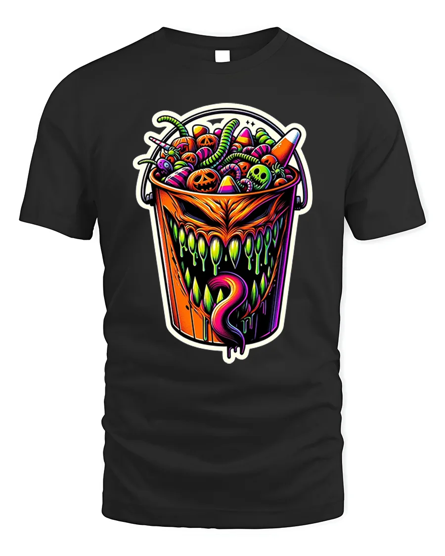 Add a wicked twist to your Halloween wardrobe with this Creepy Halloween Candy Bucket Monster T-Shirt, a bold and colorful design that perfectly captures the spooky spirit of the season.