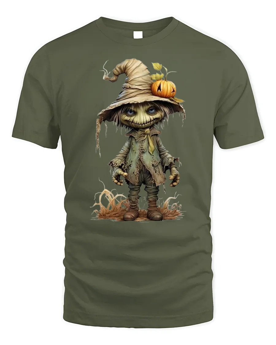 The black background brings out the earthy tones of the scarecrow’s outfit and the vibrant orange pumpkin, making it easy to match with jeans, leggings, or layered jackets. A great pick for scarecrow enthusiasts, pumpkin lovers, or anyone who wants a unique Halloween shirt, this design will definitely draw compliments.